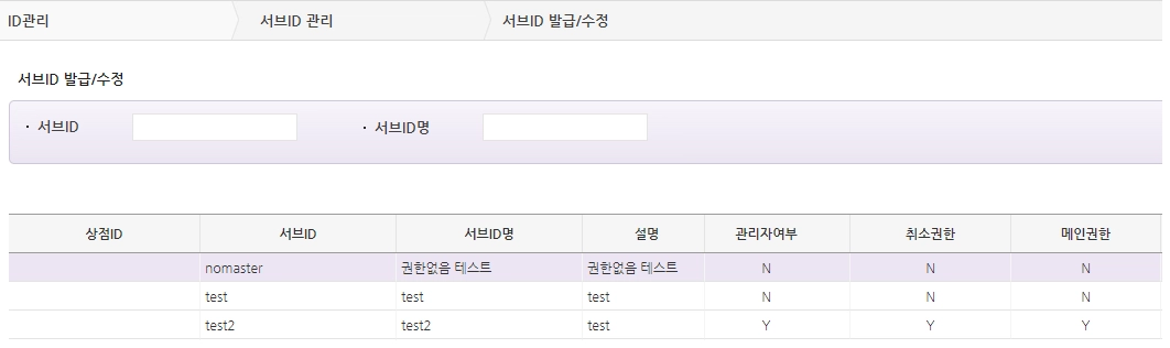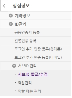 2. 상점정보 > ID관리 > 서브ID 관리 > 서브ID 발급/수정 메뉴에서 ‘관리자여부’가 ‘Y’로 설정된 Sub ID로 로그인 해야 토스비즈니스에 연결할 수 있어요.