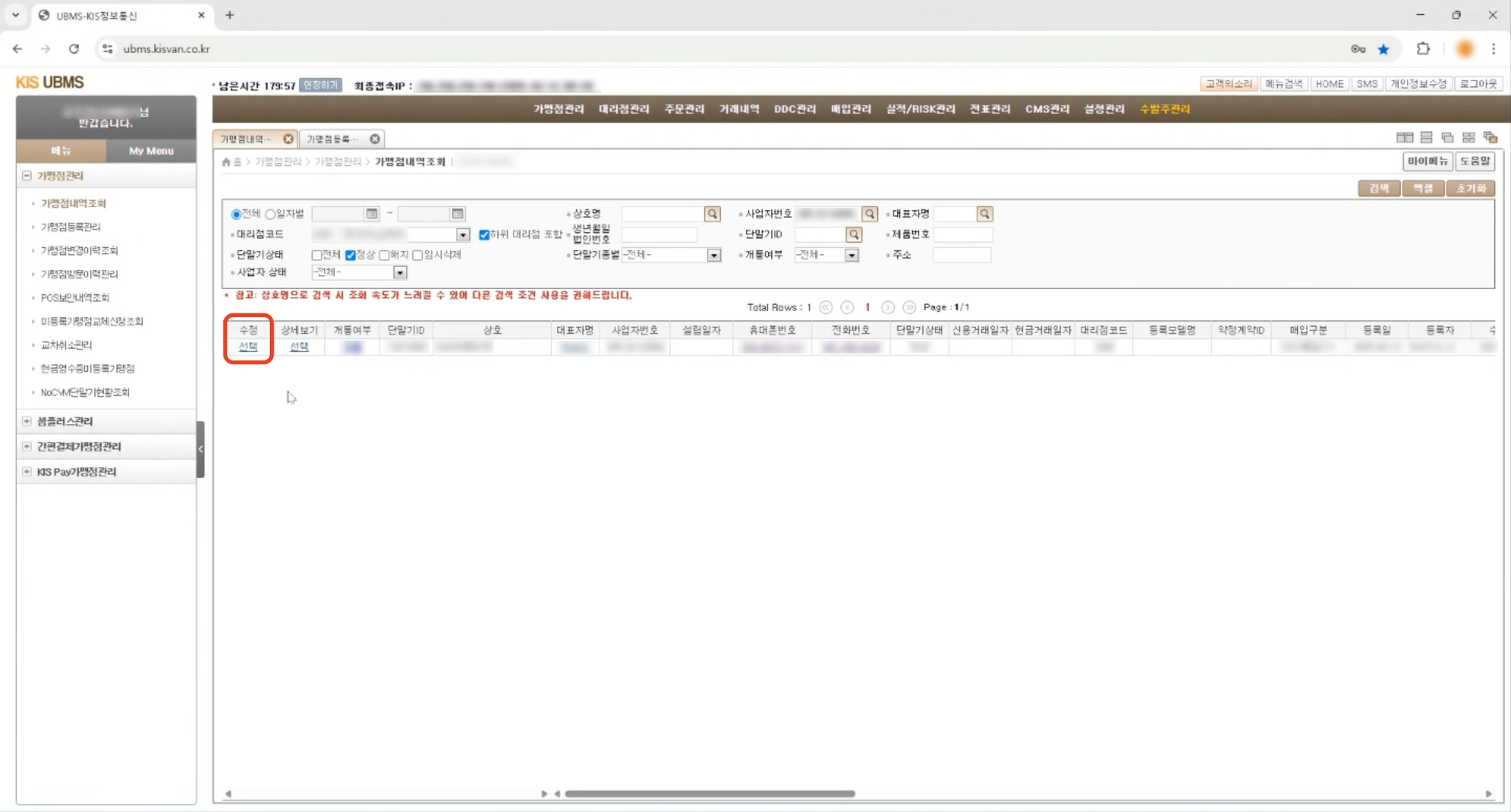 2. 가맹점 조회/수정 메뉴에 접속해주세요.