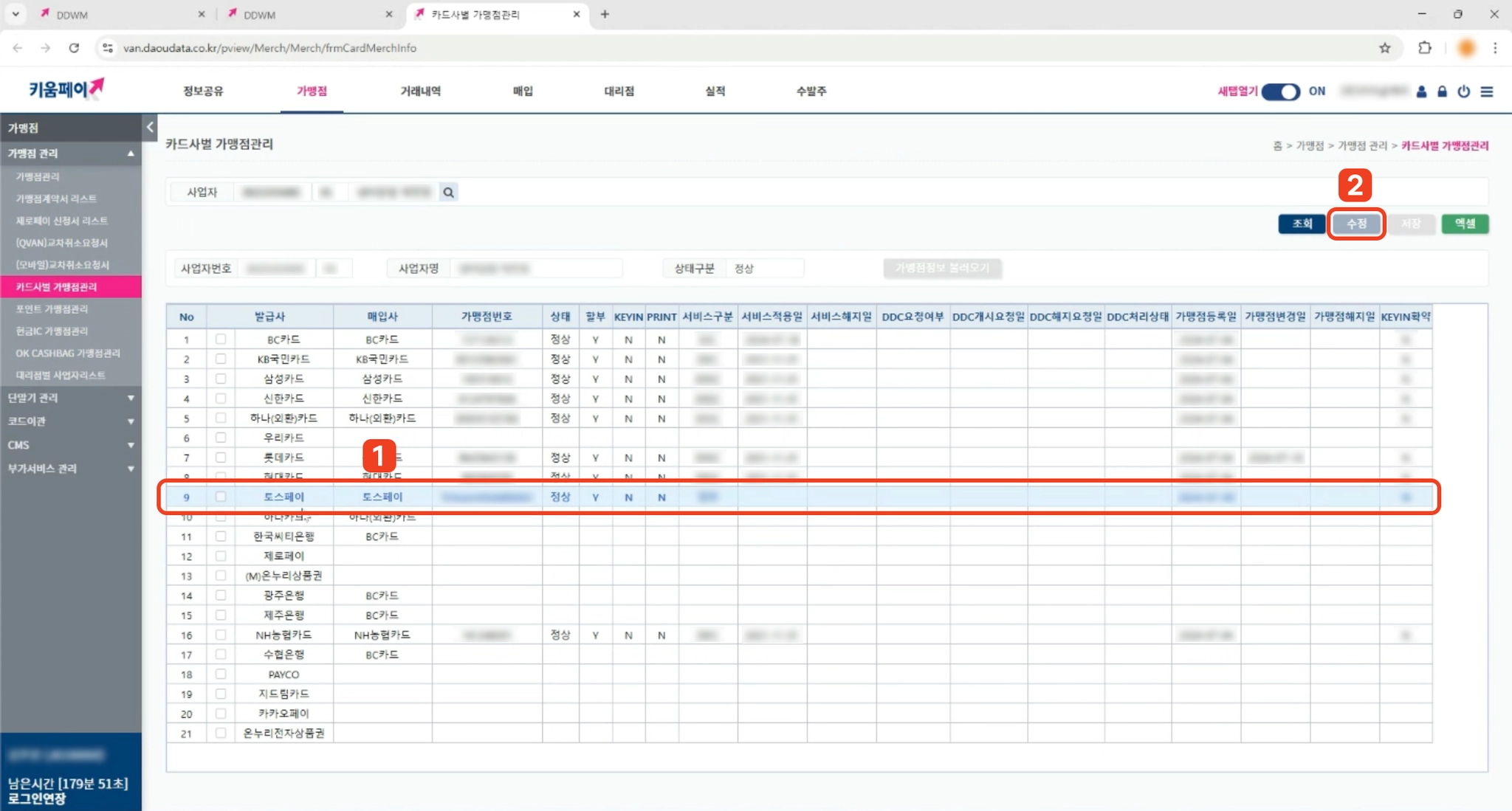 4. 조회된 표에서, 토스페이 행을 선택한 후, 오른쪽 상단의 수정을 눌러주세요.