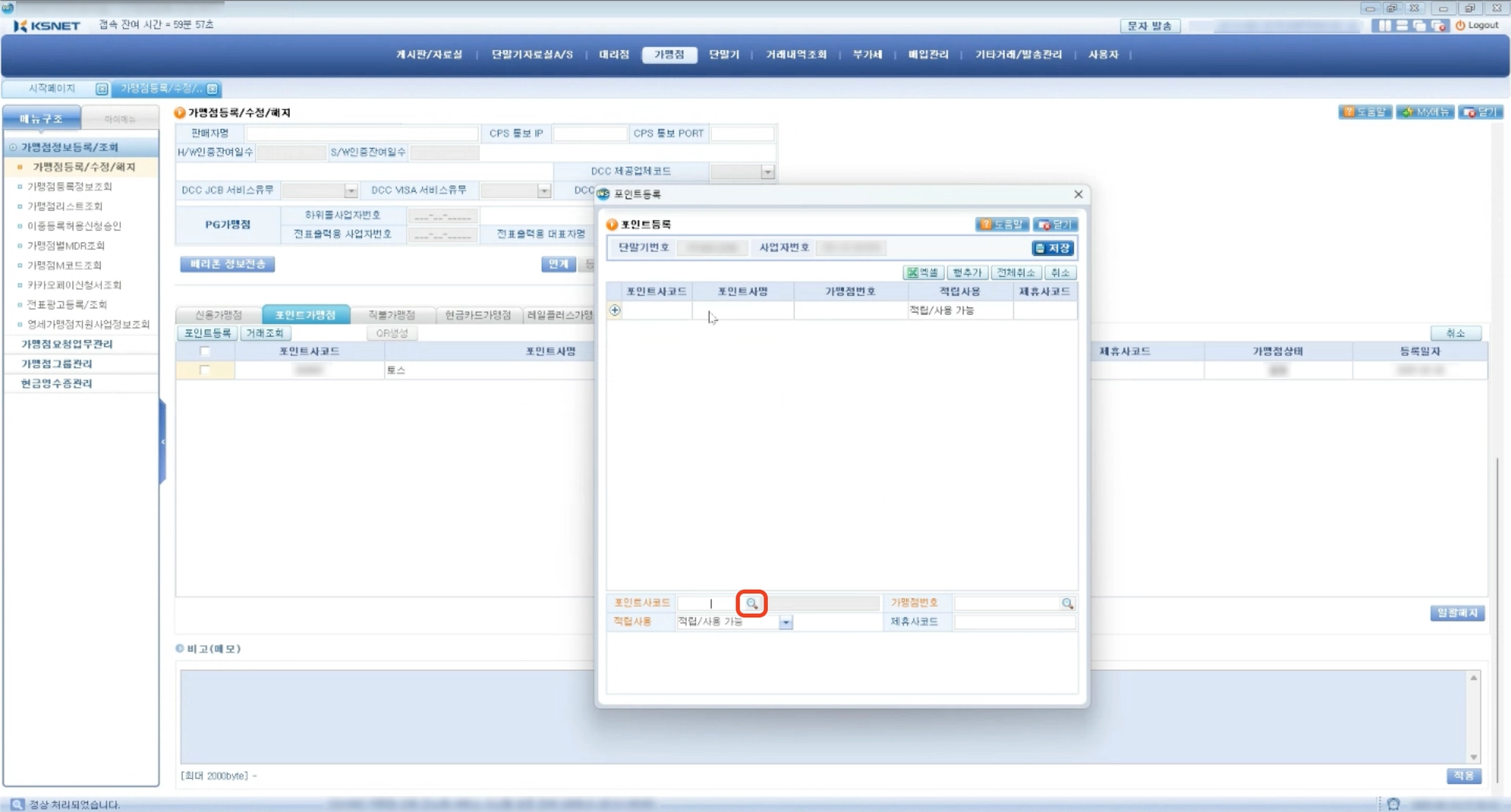 8. 다시 이전 팝업창으로 돌아가서, 가맹점번호 부분의 돋보기를 눌러주세요. 그러면 가맹점번호가 채워져요.