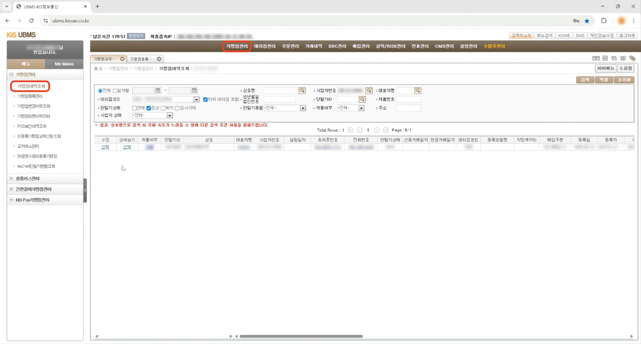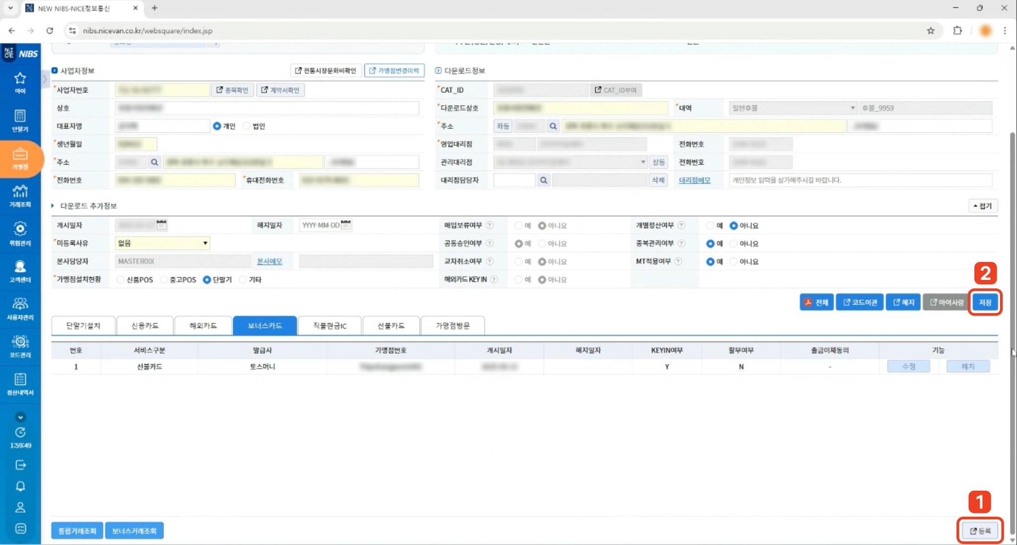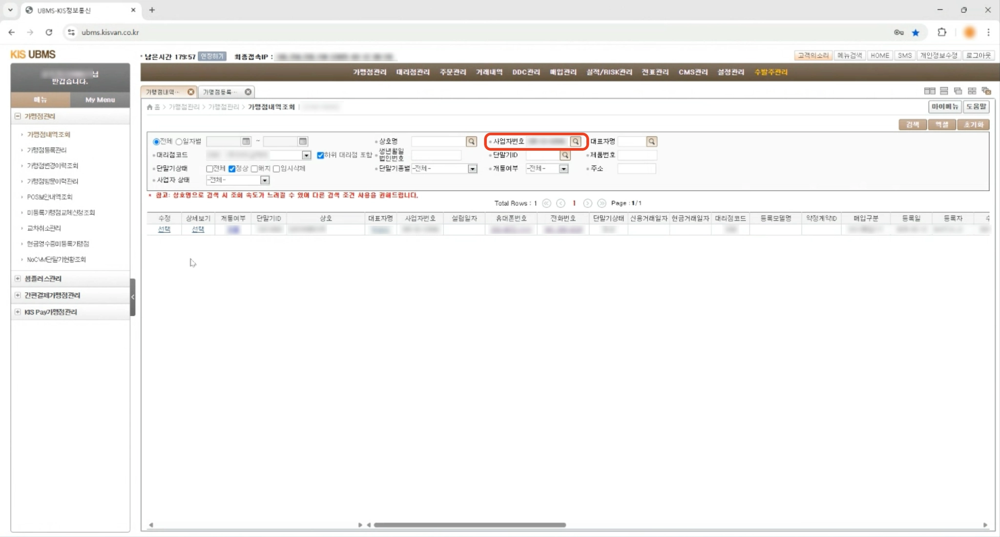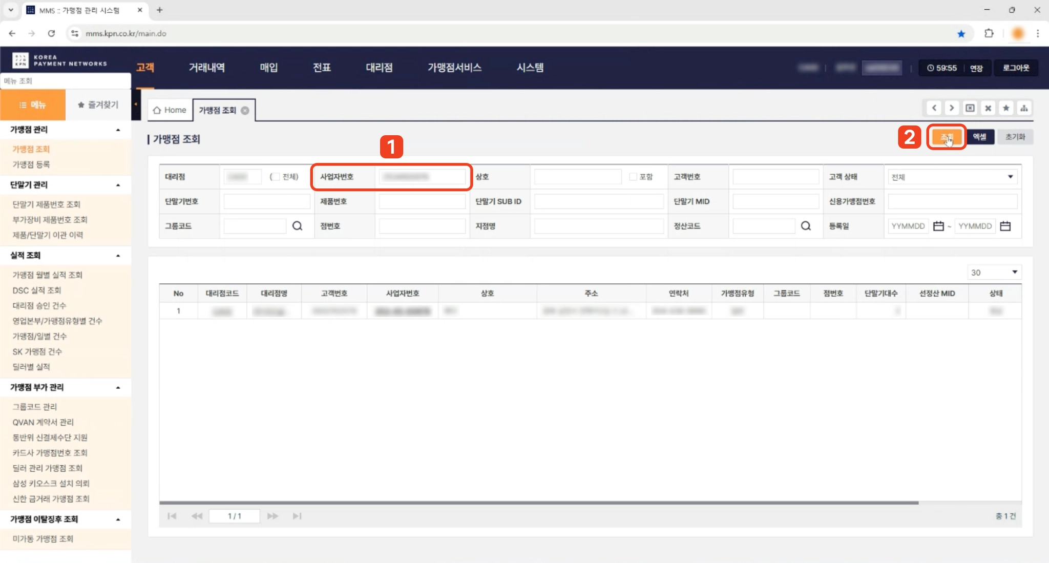 3. 왼쪽에서 사업자등록번호로 가맹점을 검색하고, 검색된 항목 중에 하나를 눌러주세요.