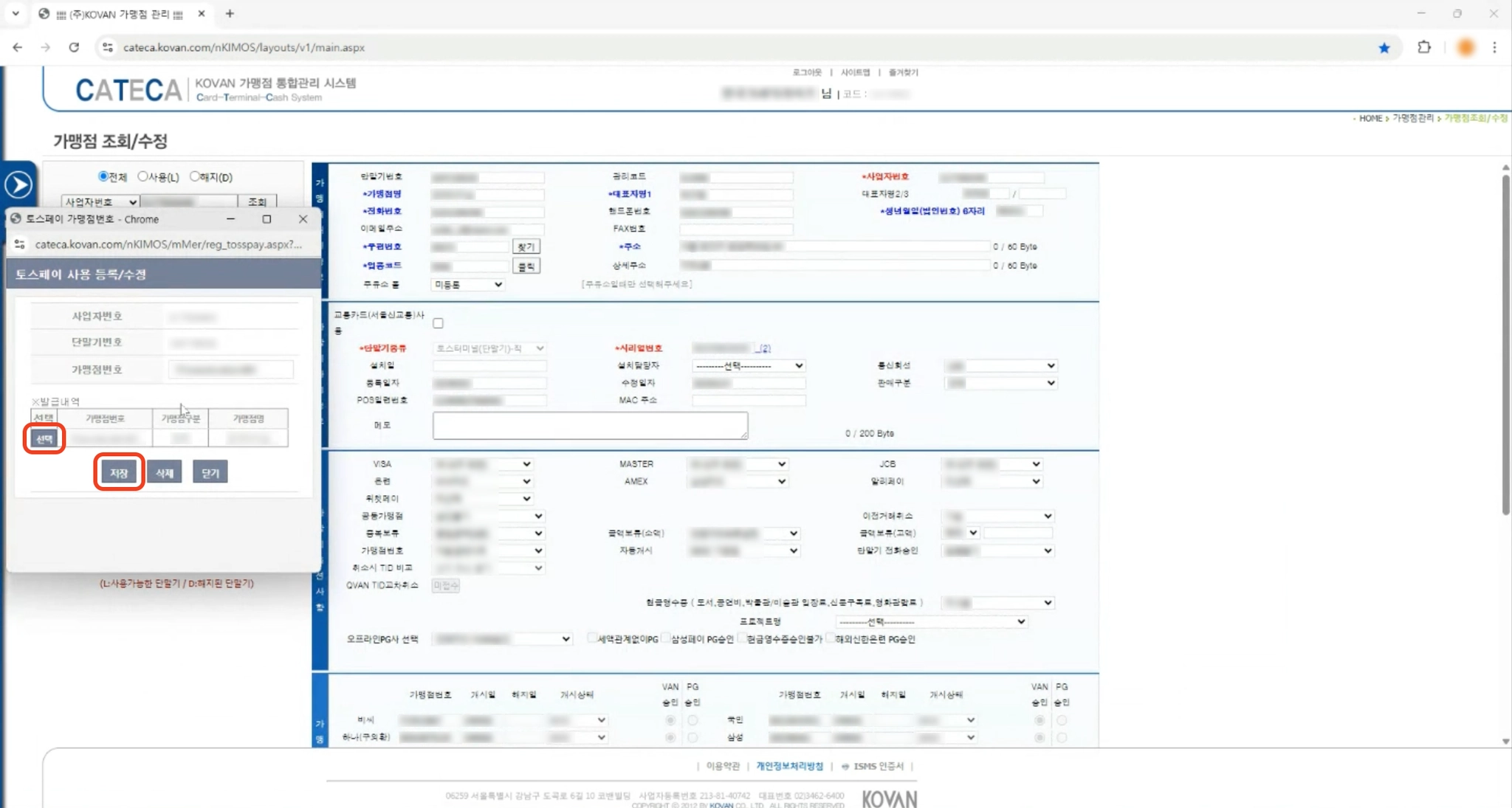 5. 팝업창에서 가맹점번호를 입력하거나 선택한 후, 저장을 눌러주세요.