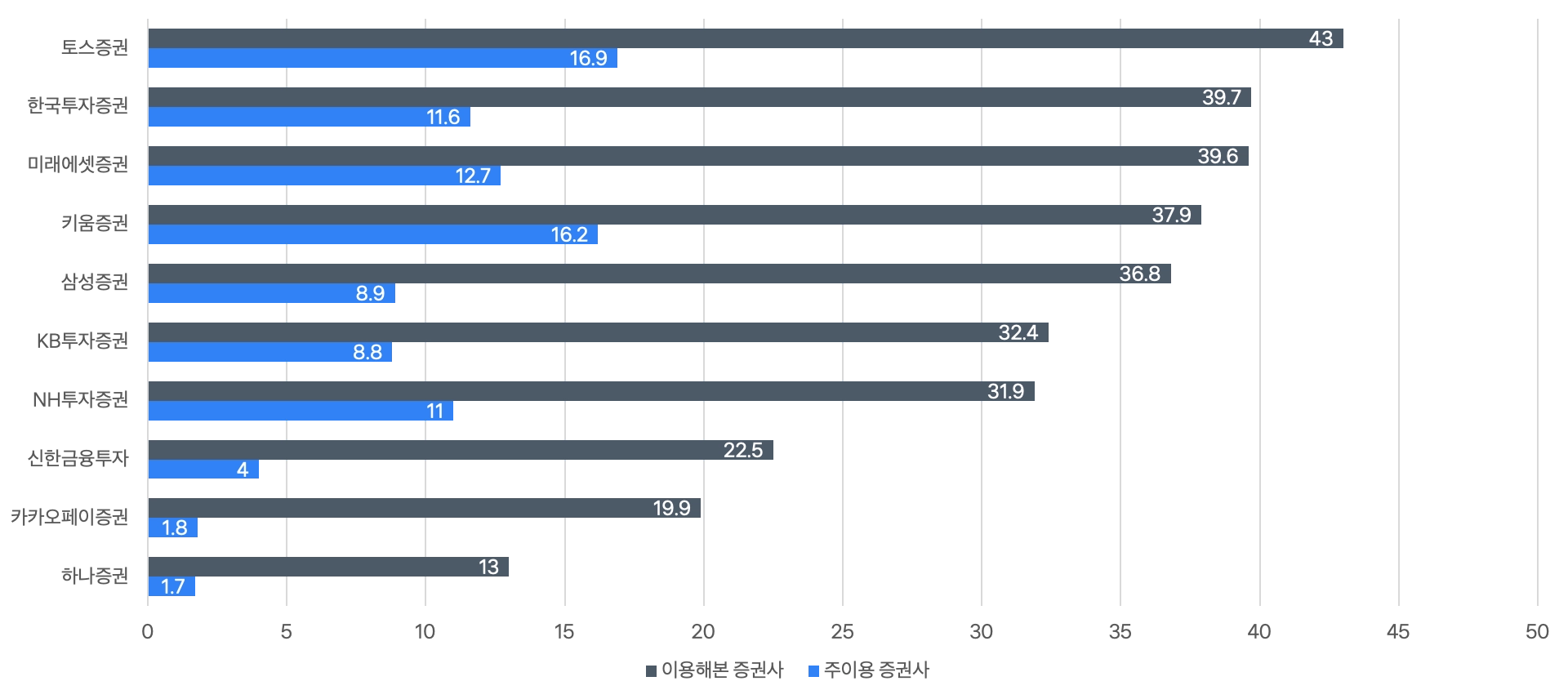 한번쯤 써본 증권사인지, 주로 이용하는 증권사인지 비교