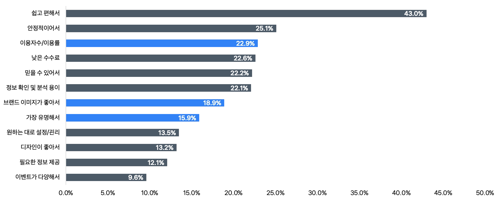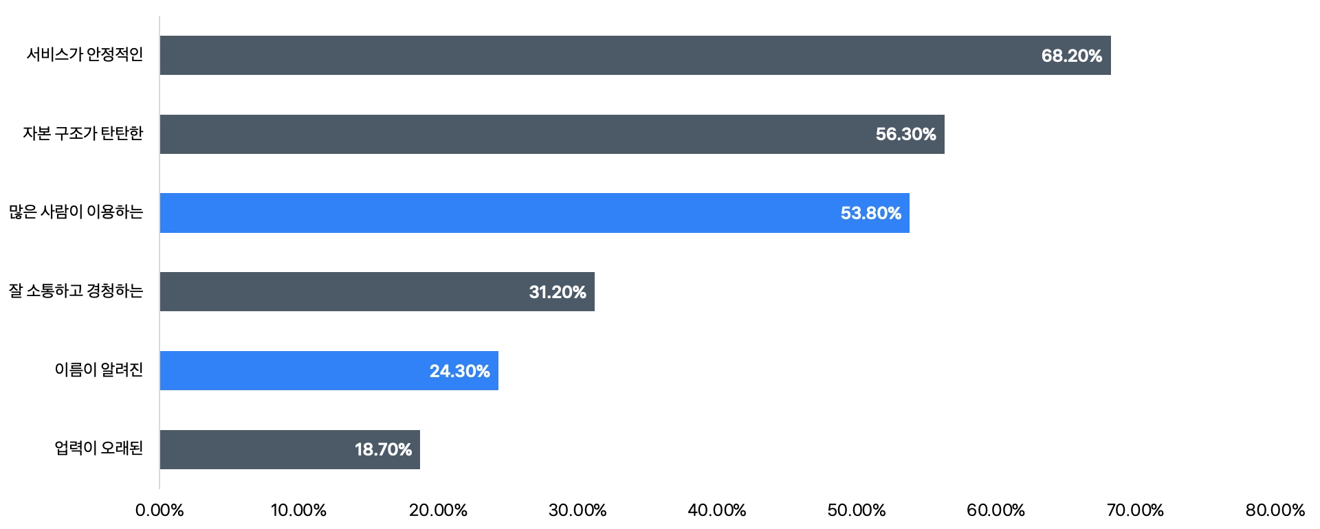 ‘서비스가 안정적인’이 68.2%로 1위, ‘자본 구조가 탄탄한’이 56.3%로 2위 기록 → 내 자산을 믿고 맡길 수 있는지에 대한 신뢰의 개념으로 풀이됨