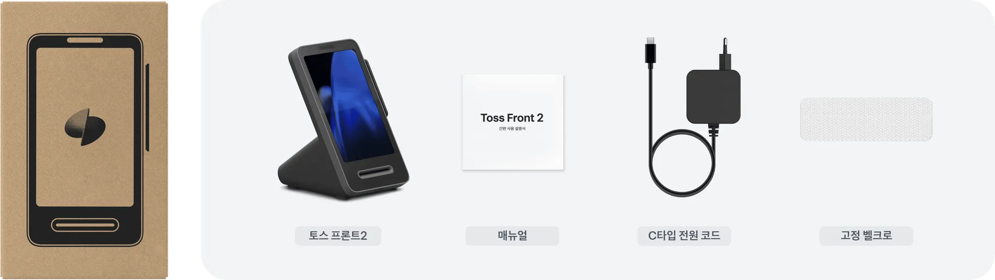토스 프론트2: 제품(프론트2), C타입 전원코드, 고정 밸크로, 간단 설명서, 윈도우 PC 연결용 케이블(일부 패키지)