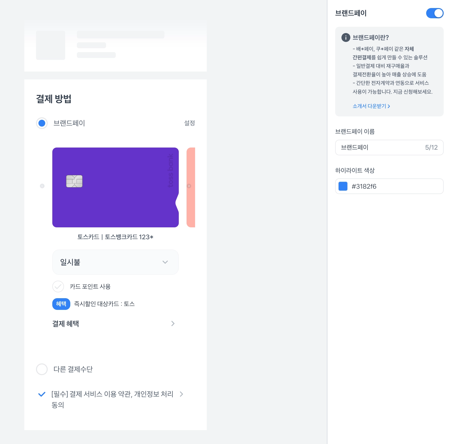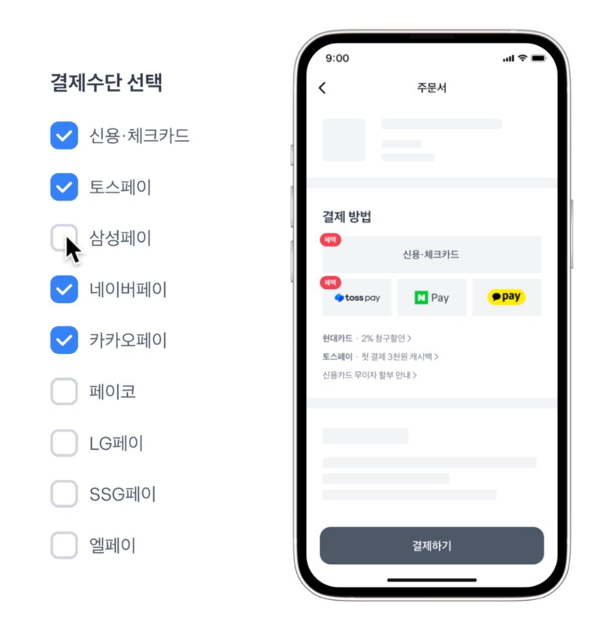 개발자 없이도 결제수단 추가, 제거, 순서 변경, 레이아웃, 디자인, 공지사항, 배지 등 모두 수정 가능.
