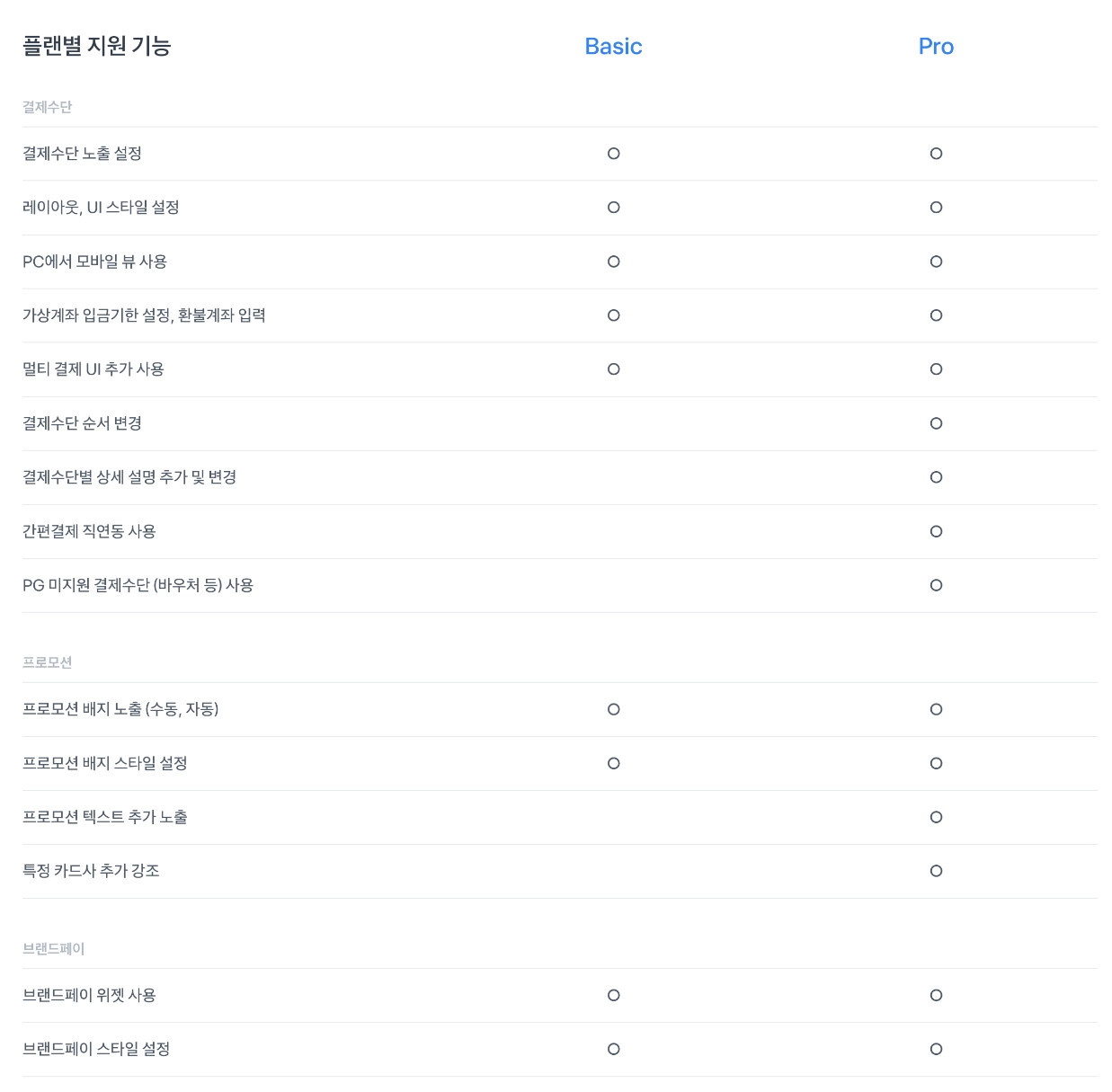 결제 위젯은 Basic 플랜과 Pro 플랜으로 나누어 구성되고, Basic 플랜은 추가요금을 부과하지 않아요. Pro 플랜은 기본 0.5%의 추가수수료를 부과합니다. (신용카드 및 간편결제)