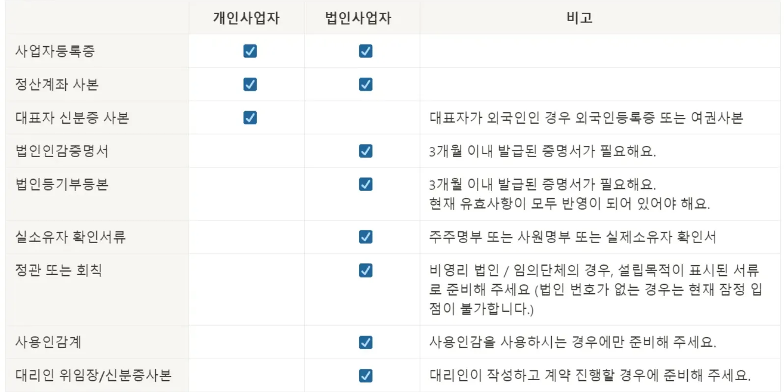 일부 업종에 따라 필요 시 아래 필수 서류 외 추가 첨부 서류 요청 가능