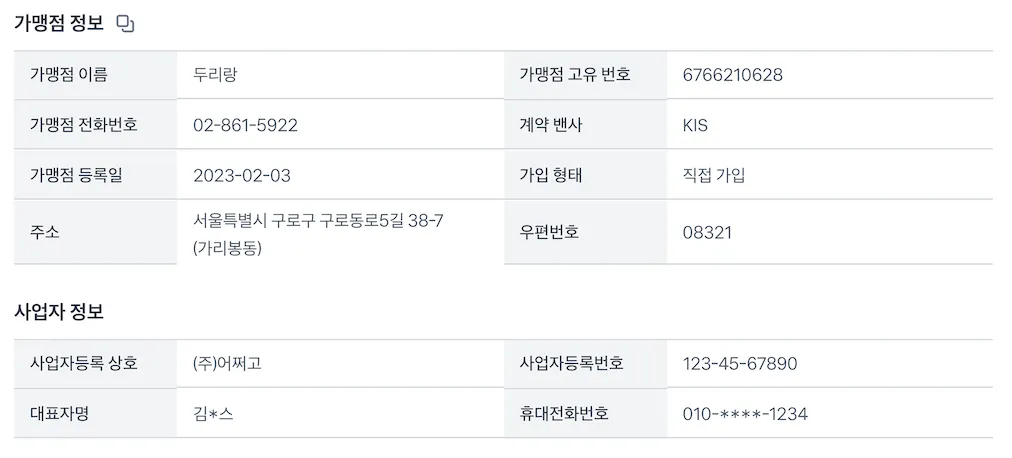 사업자 정보 : 가맹점의 사업자등록증 상 정보를 입력해주세요.
