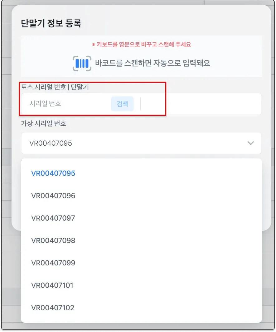 토스 단말기 외관 박스에 있는 토스 시리얼 넘버를 입력하고 저장을 눌러주세요.