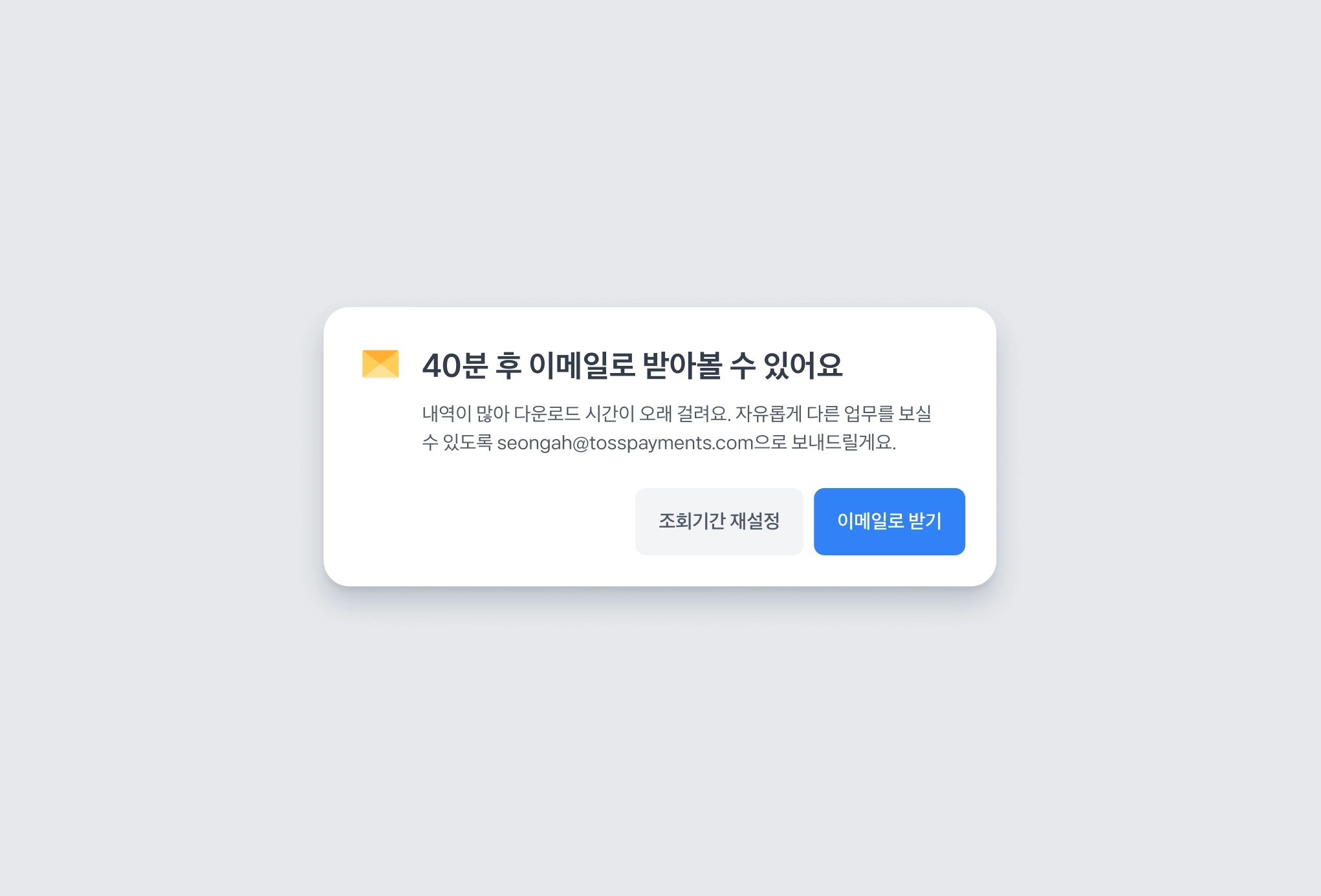 대용량(2.5만 건 이상) 다운로드는 시간이 더 걸려요. 소중한 시간, 더 중요한 곳에 쓰실 수 있게 토스페이먼츠가 대신 다운로드 해서 이메일로 보내드릴게요.