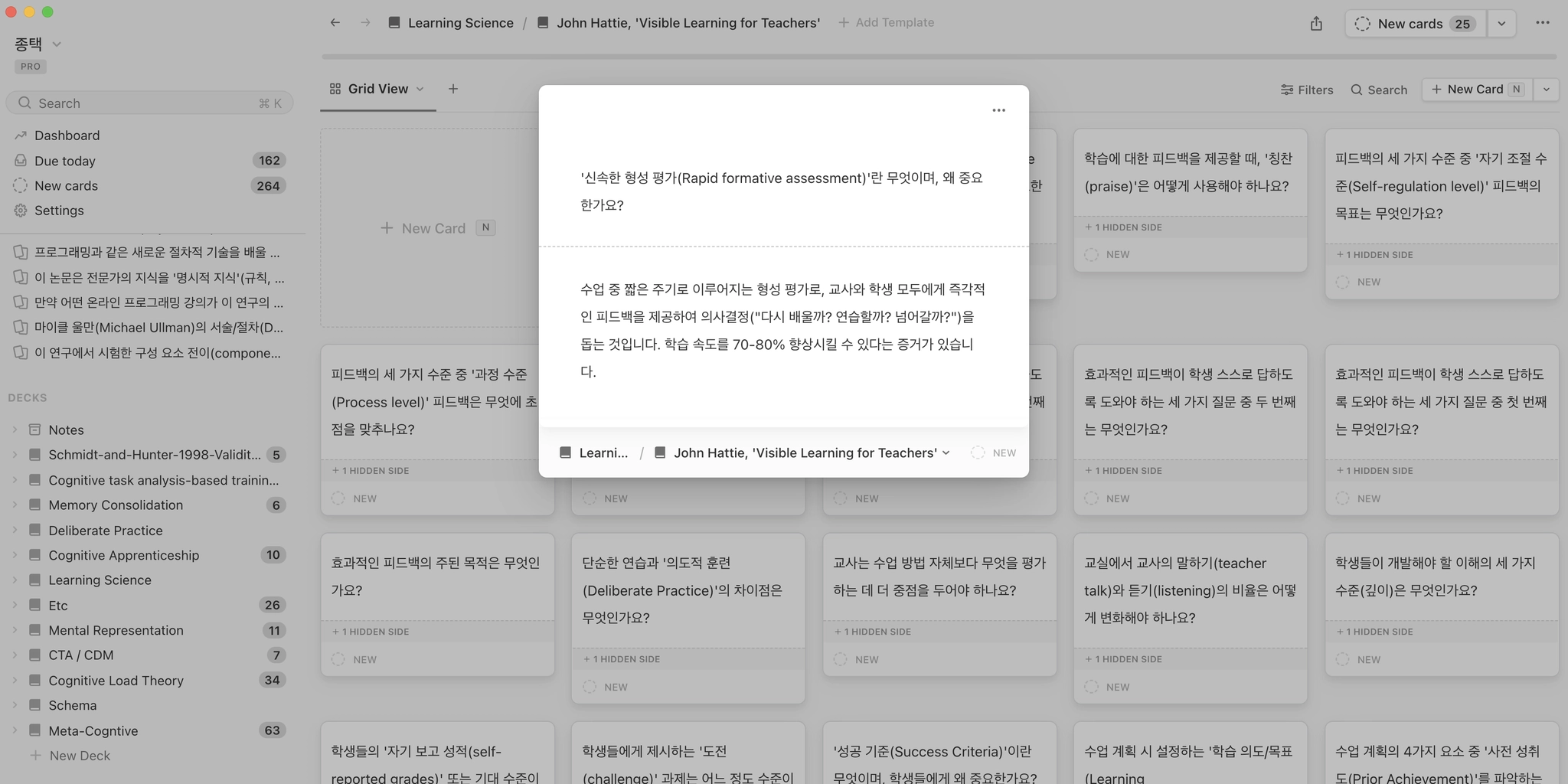 4단계: Anki에 등록: 이제부터 간격 반복 학습이 시작되는 거예요. 하루 10분씩 카드를 복습하면, 자동으로 망각 곡선을 이기는 복습 스케줄이 잡힙니다.