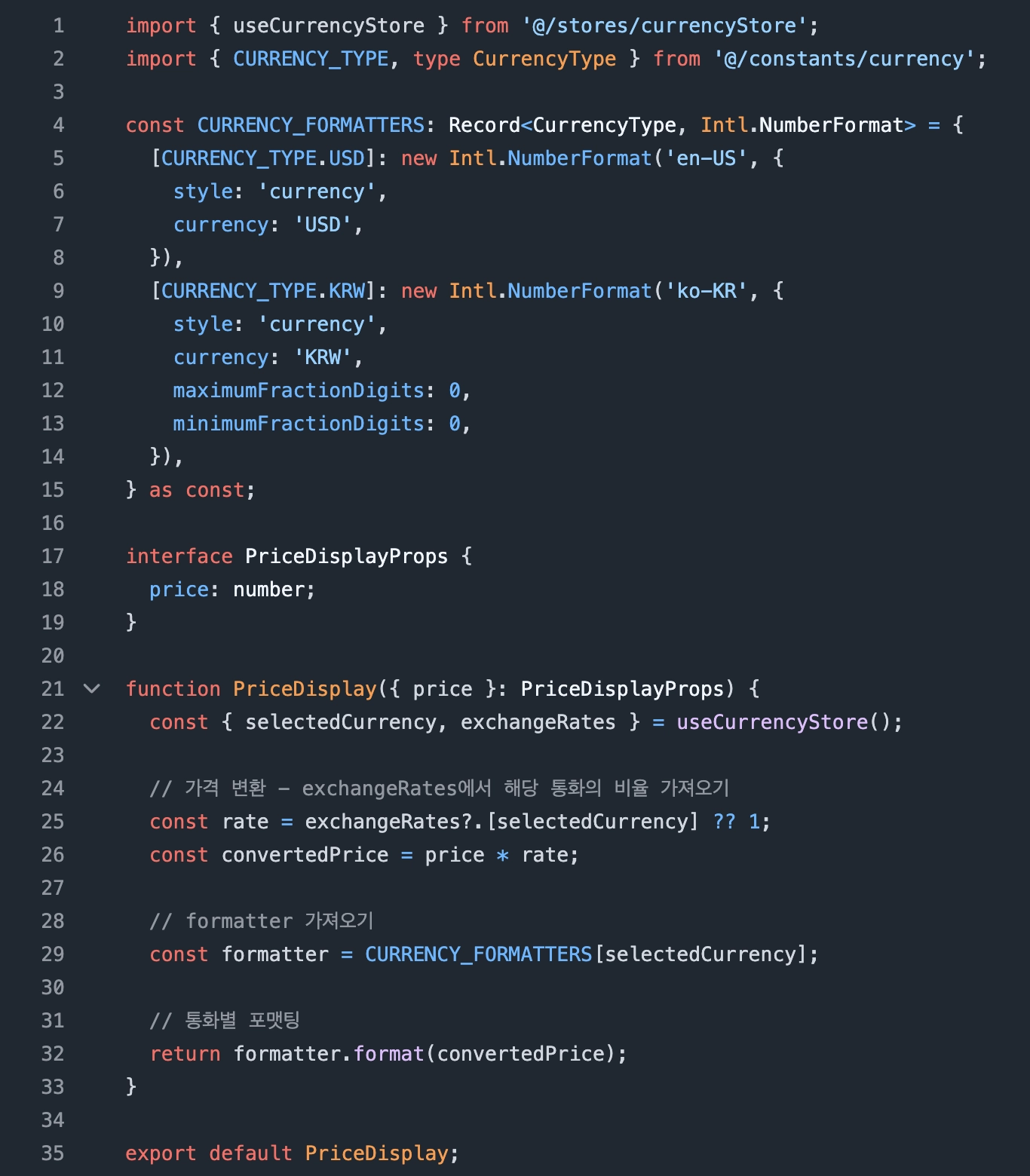선택한 통화에 따라서 가격을 다르게 보여주는 기능<PriceDisplay /> 에서 담당하고 있습니다. (코드 블럭: 38번 라인)
