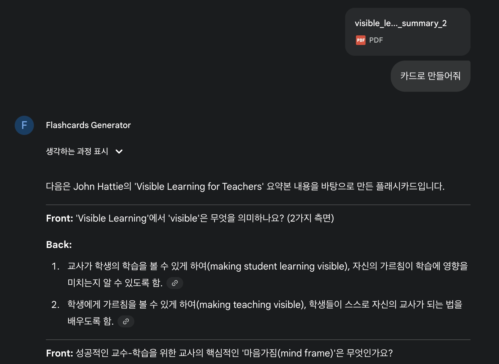 3단계: 플래시카드 생성: "이 논문들의 핵심 개념을 플래시카드로 만들어줘"