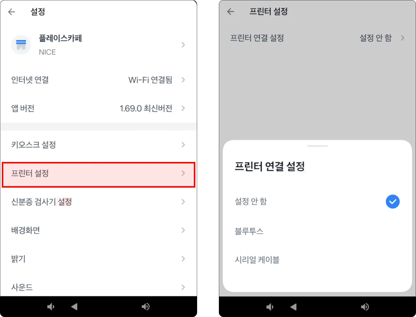프린터 설정에서 프린터 연결 설정을 눌러 프린터기 유형에 맞게 선택해주세요.