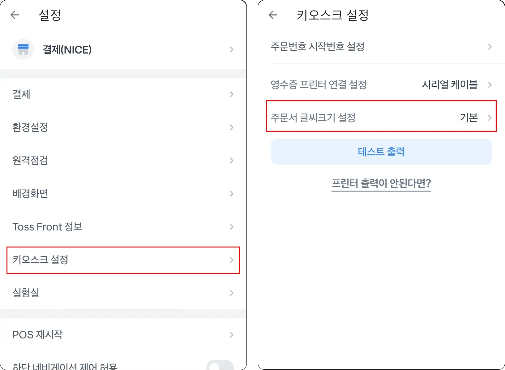 키오스크 설정에서 주문서 글씨크기 설정을 눌러주세요.