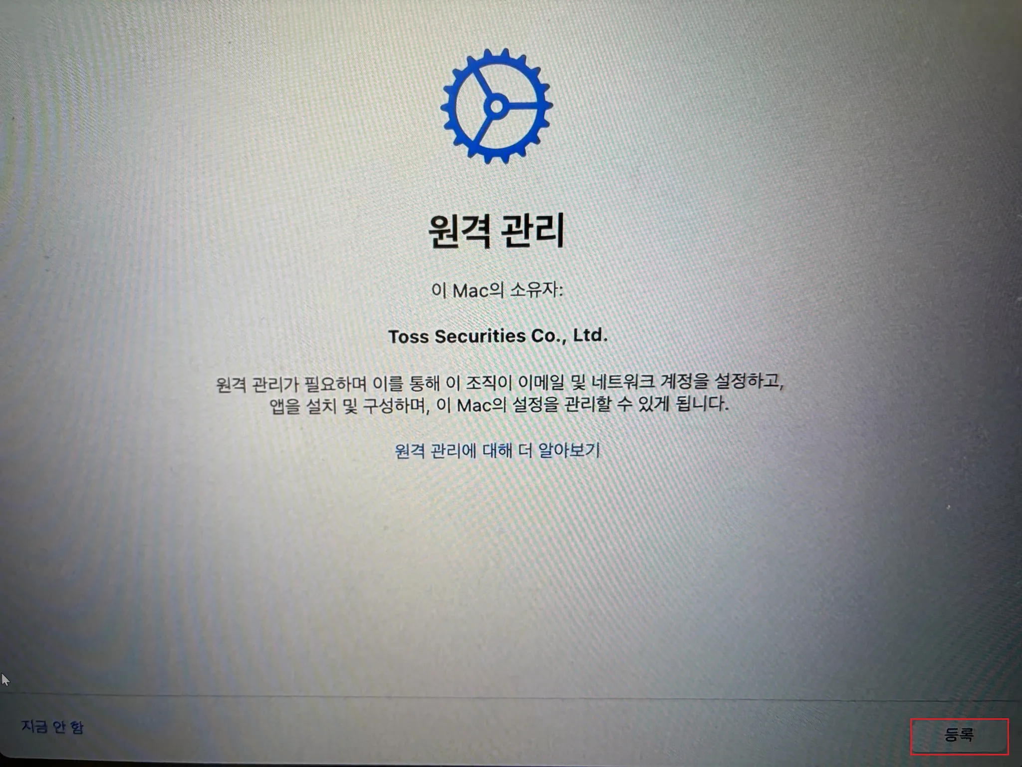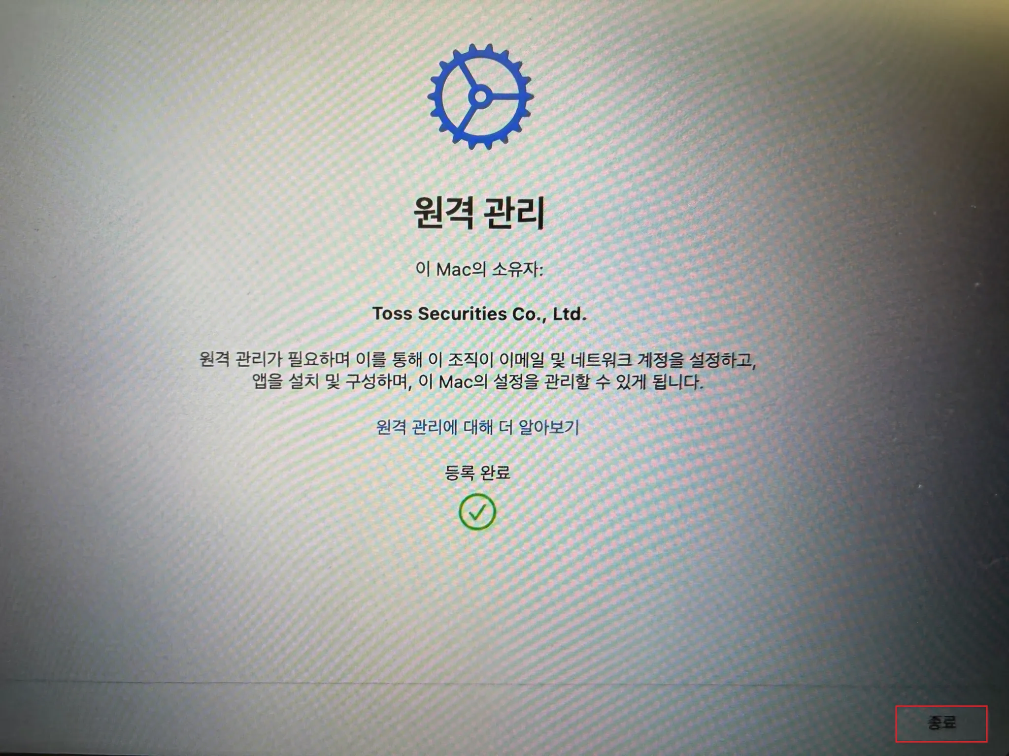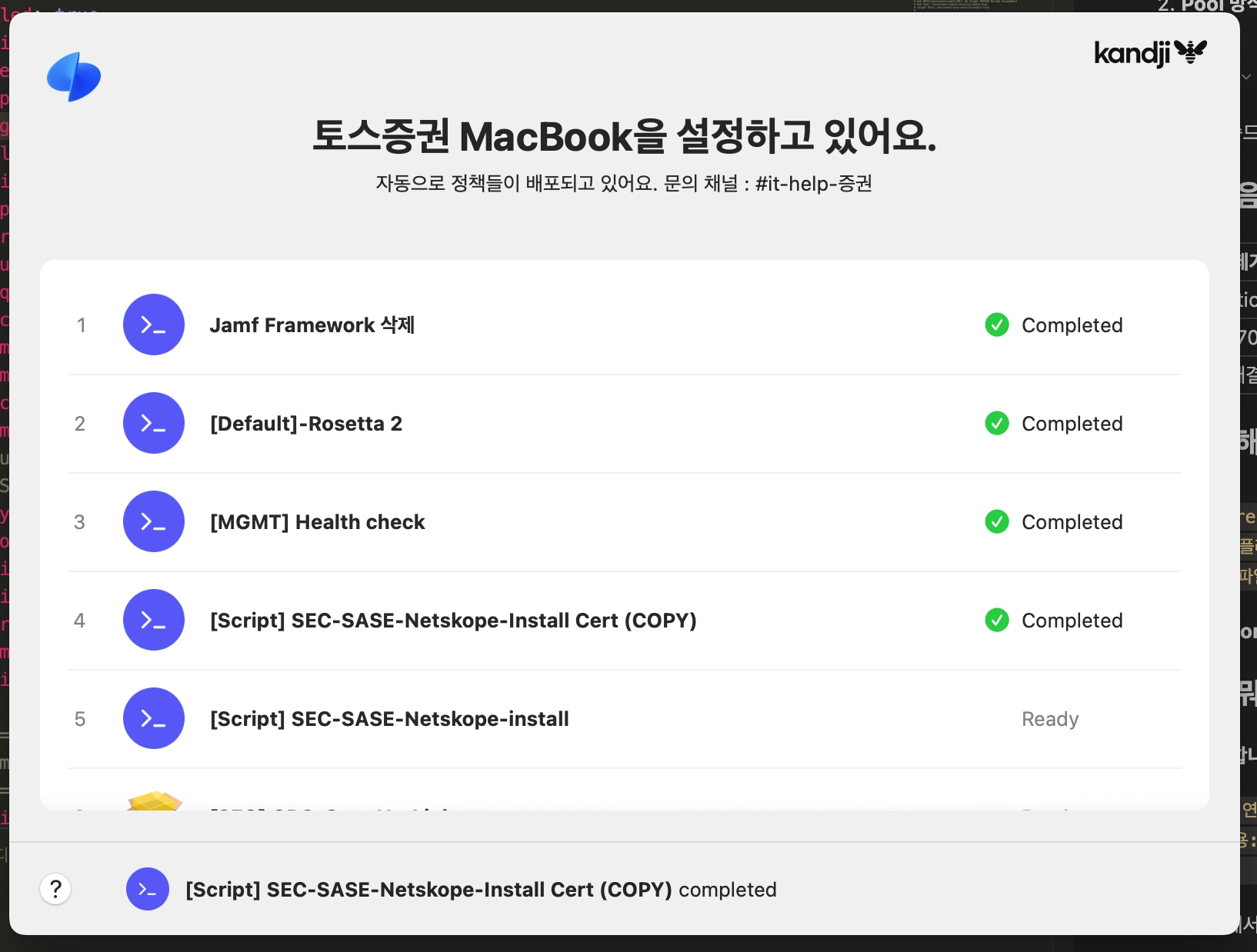 macOS를 전체 관리하는 솔루션인만큼 이슈가 있으면 #it-help-증권 에 문의해주시면 감사해요.