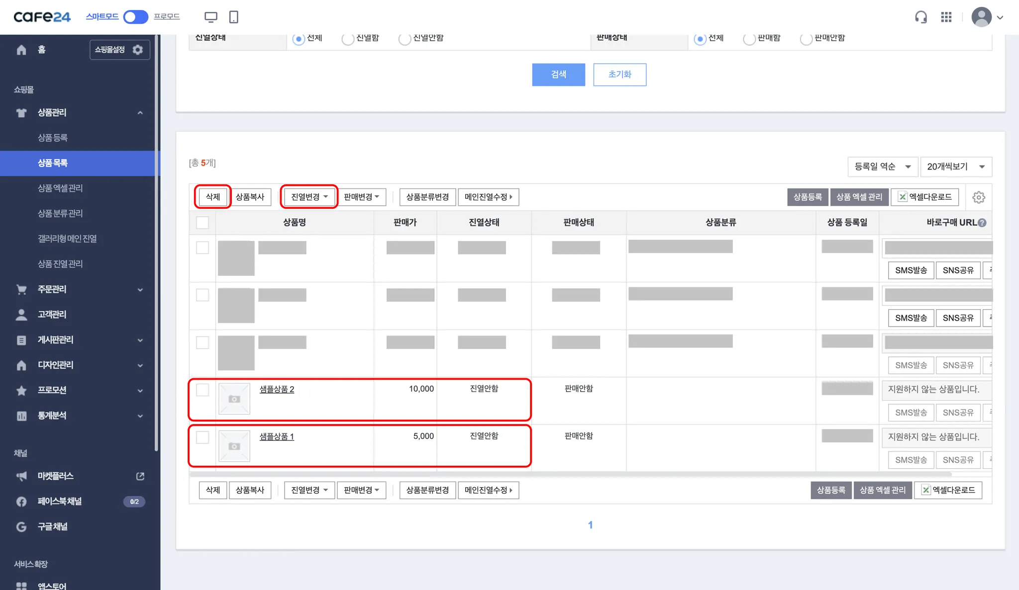 진열함, 판매함으로 설정해주셔야 상품이 쇼핑몰에 제대로 노출됩니다.