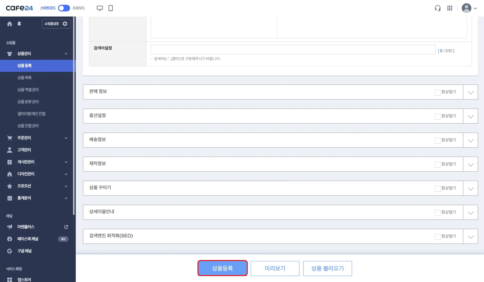 카페24 관리자 페이지 (스마트 모드) > 상품관리 > 상품등록 페이지에서 상품정보를 입력해주세요.