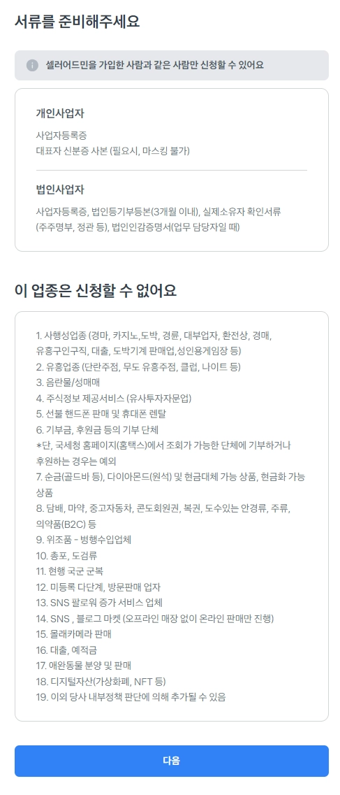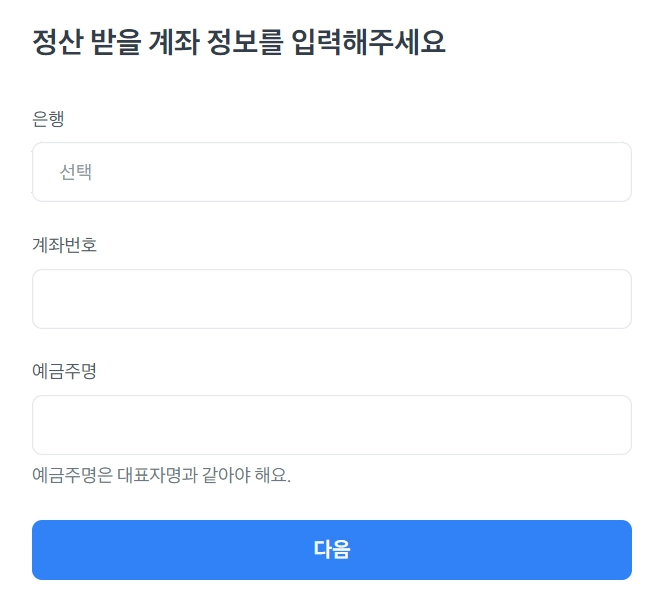 개인사업자의 정산 계좌는 대표자와 예금주명이 같아야 등록이 가능해요
