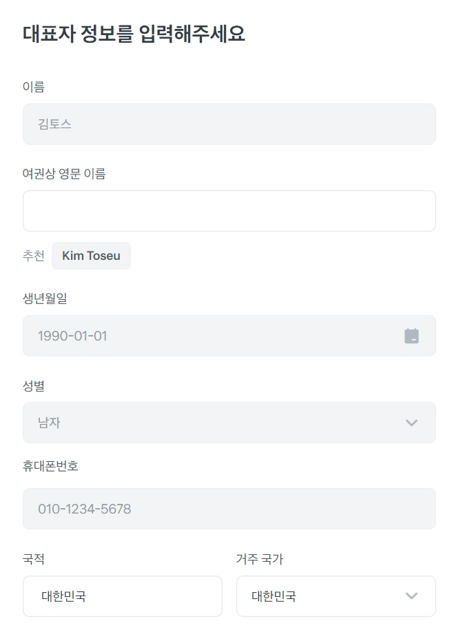 사업자 등록증에 있는 대표자 정보를 입력해 주세요
