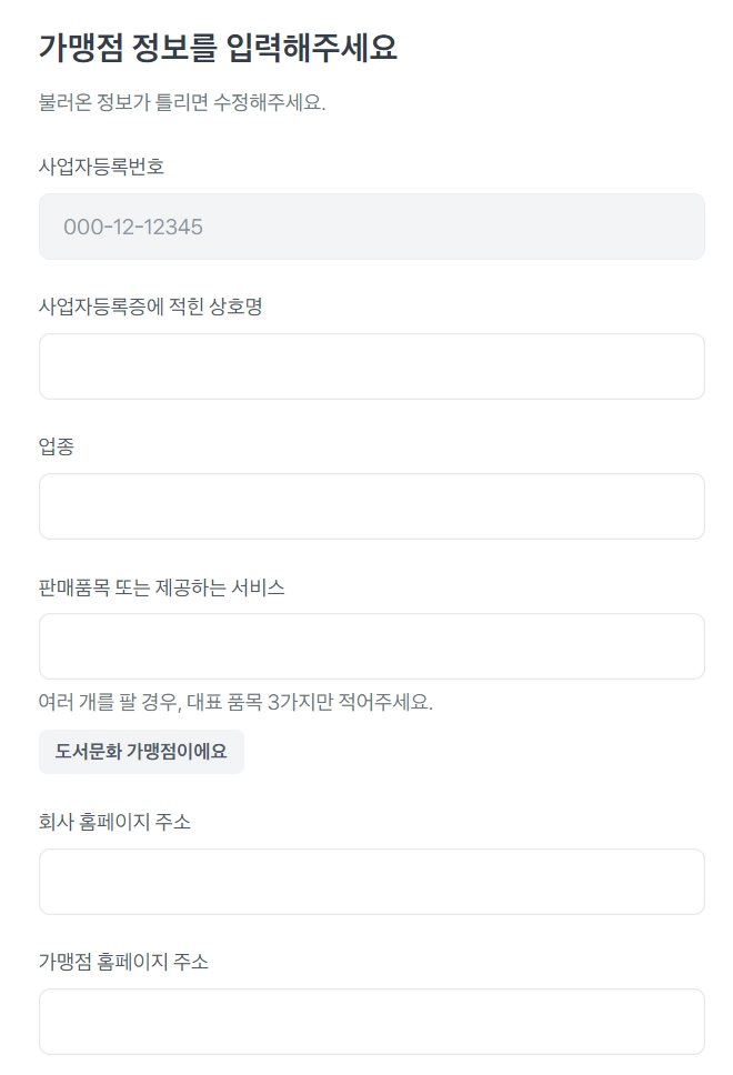 첨부한 사업자 등록증에서 불러온 정보를 확인하고 잘못된 정보가 있다면 수정해 주세요