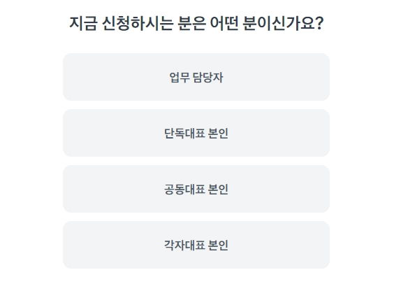 [단독대표 본인] 사업자등록증에 대표님이 한 분, 대표님 본인이 직접 신청할 때 선택해 주세요 [공동대표 본인] 사업자등록증에 대표님이 2분 이상, 공동대표님 중 직접 신청할 때 선택해 주세요