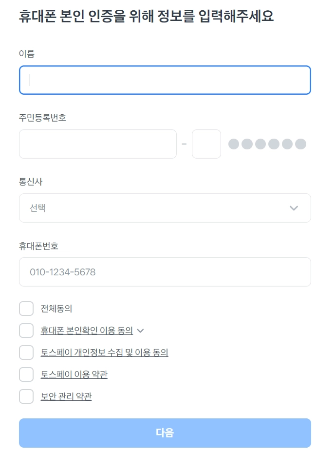 현재 계약중인 분의 정보를 입력하여 휴대폰 본인 인증을 해주세요. (법인폰, 공용폰 불가)