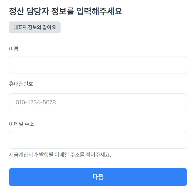 대표자 정보와 같아요를 누르면 대표자 정보로 자동으로 채워져요