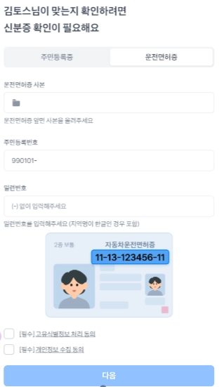 예를 들어, 업무 담당자라면 대표자의 정보가 아닌 담당자의 정보로 인증을 진행해 주세요.