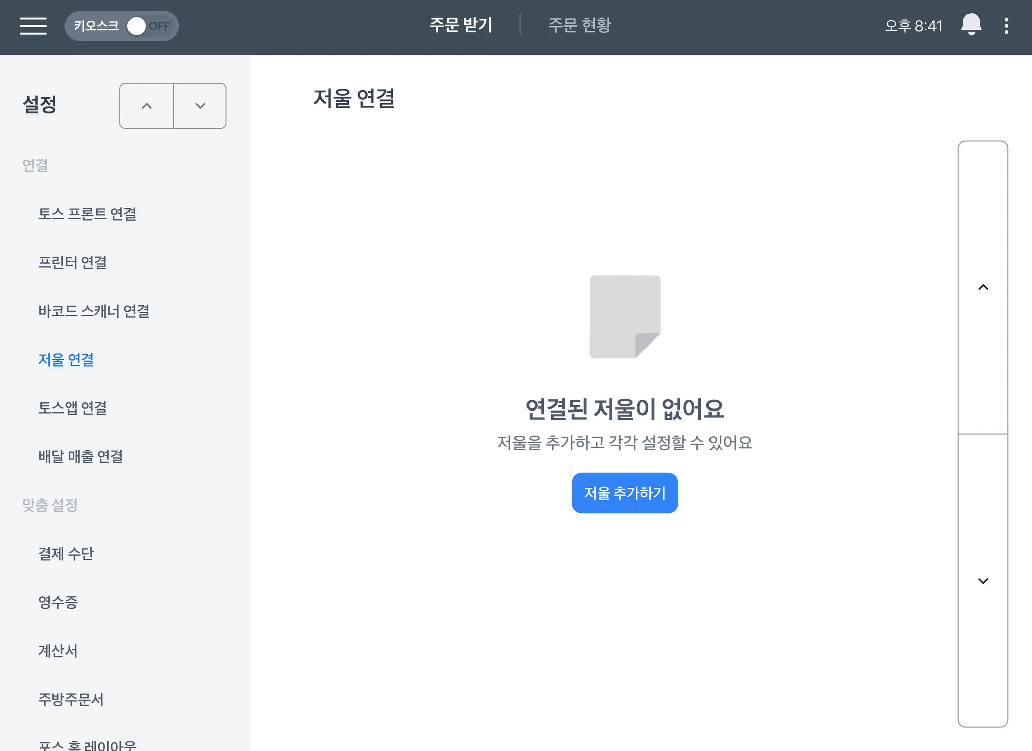 2. 포스 메뉴 [≡] > [설정] > [저울 연결] > ‘저울 추가하기’ 클릭