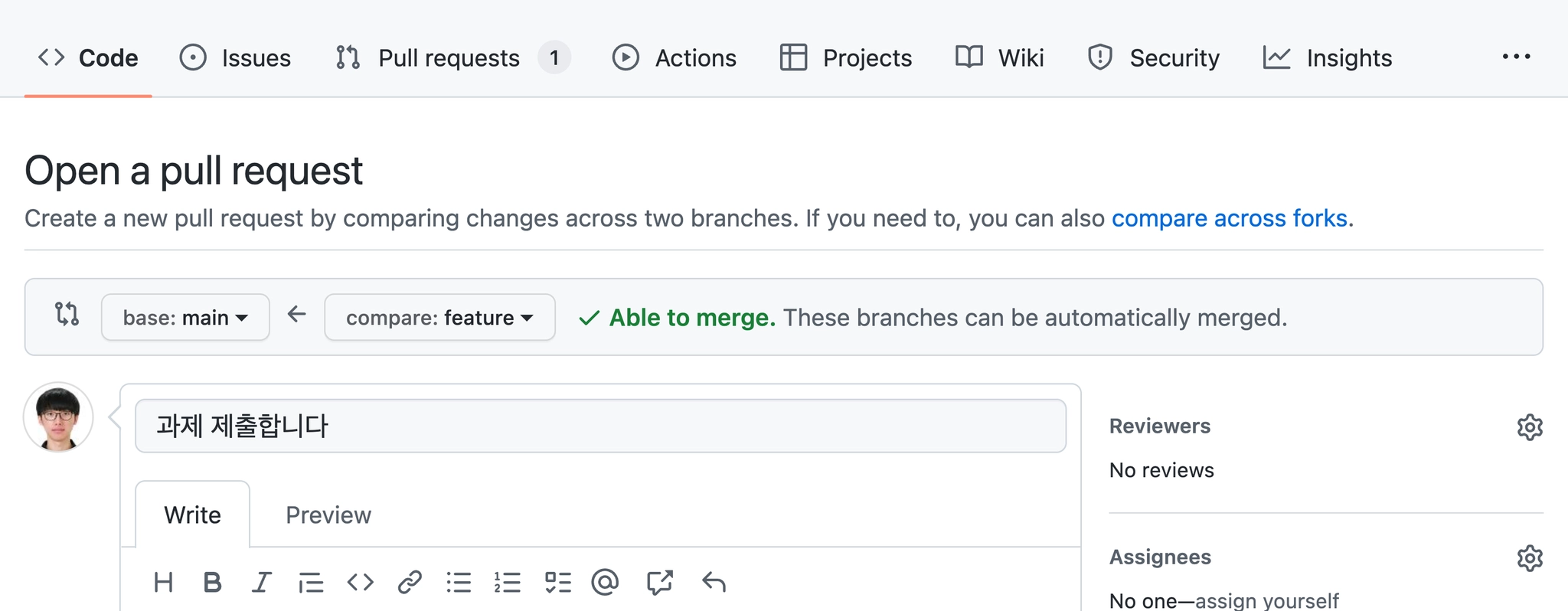 [Compare & Pull Request] 버튼을 누르고 Pull Request를 생성해주세요. Pull Request의 제목이나 내용은 자유롭게 작성해주세요.
