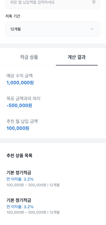 사용자는 목표 금액과 저축 기간을 입력하면, 필요한 월 납입액을 계산하고 조건에 맞는 적금 상품을 추천받을 수 있어요.