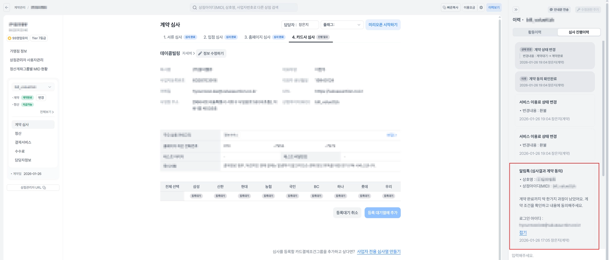 페이먼츠매니저에 접속하시면 세일즈분들도 확인하실 수 있어요. MID 계약 페이지 접속 시 우측 심사 진행이력에서 계약 동의 발송 이력 및 계약 동의 완료여부 확인 가능합니다.