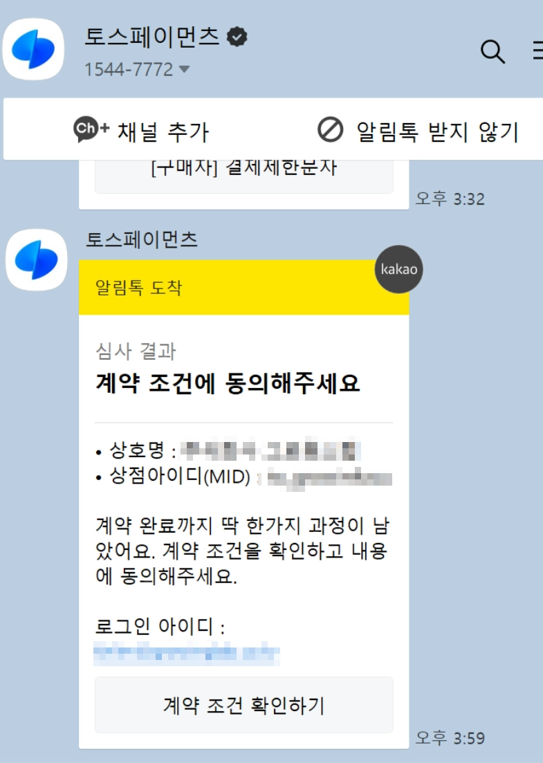 카카오톡/메일을 통해 계약 조건에 동의해달라는 안내 발송 > 계약 조건 확인하기 버튼을 누르면 상점관리자 로그인 페이지로 이동, 신청 시 입력하신 신청인 이메일 계정으로 로그인 > 페이지에 안내되어있는 정산/수수료 조건 등 확인 후 동의합니다 버튼 클릭, 동의 완료.