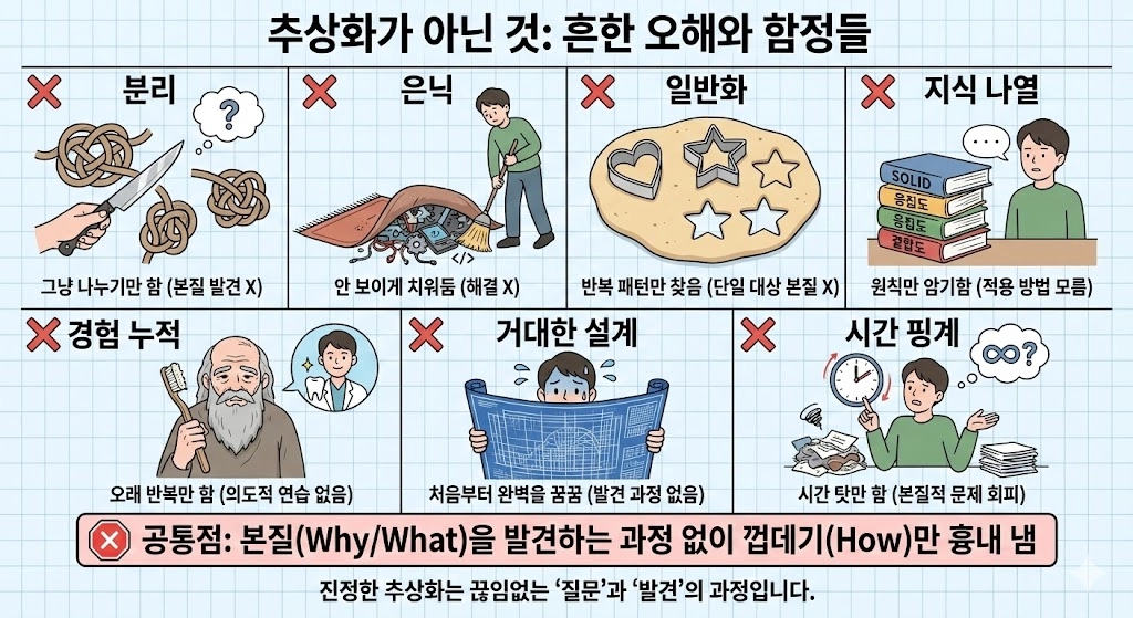 이 모델을 받은 사람이 흔히 빠지는 함정들이 있어요. 공통점은 하나예요. 본질을 발견하는 과정 없이 추상화의 결과만 얻으려는 것.