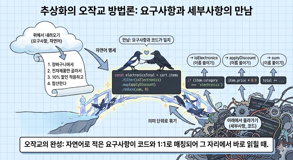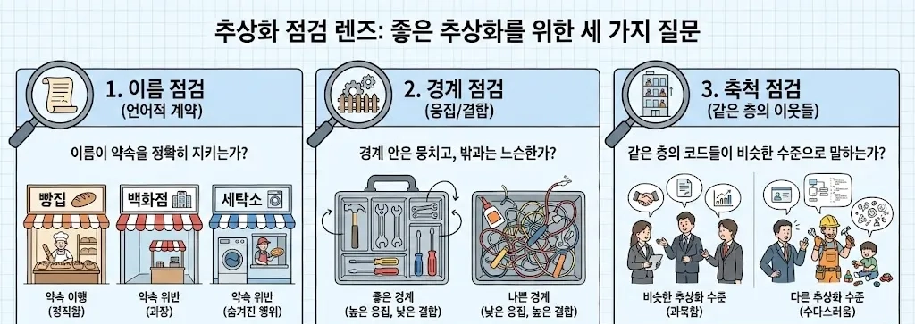 좋은 추상화는 결국 좋은 이름을 통해 달성돼요. 이름이 요구사항의 의도를 정확히 전달하고, 약속을 철저하게 지킬 때요.
