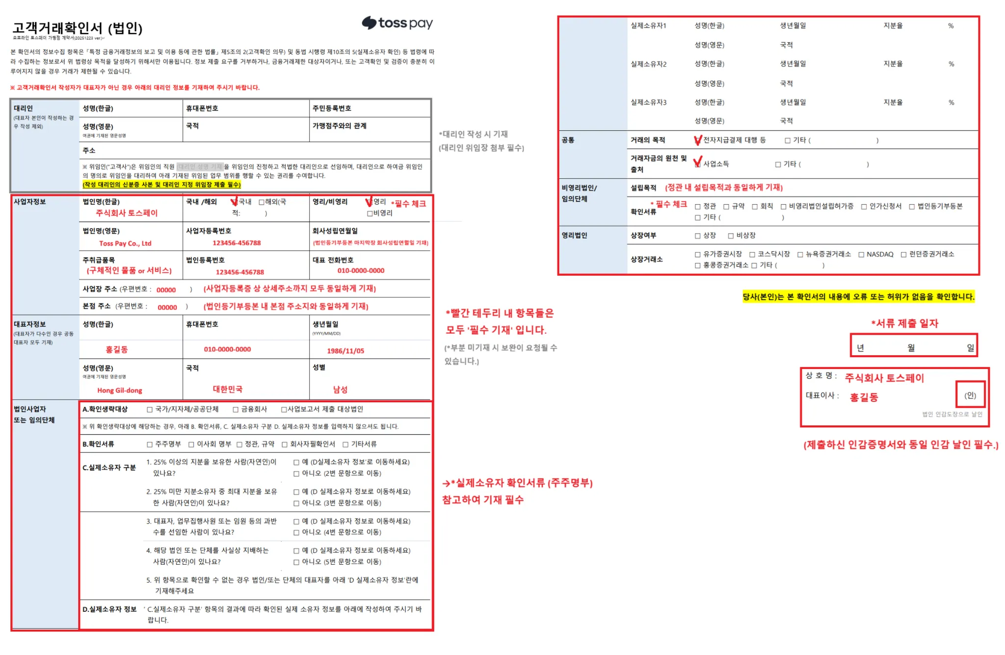 실제소유자 확인 서류 (주주명부, 정관 등) | 자연인 생년월일, 국적, 성별 필수 포함 |