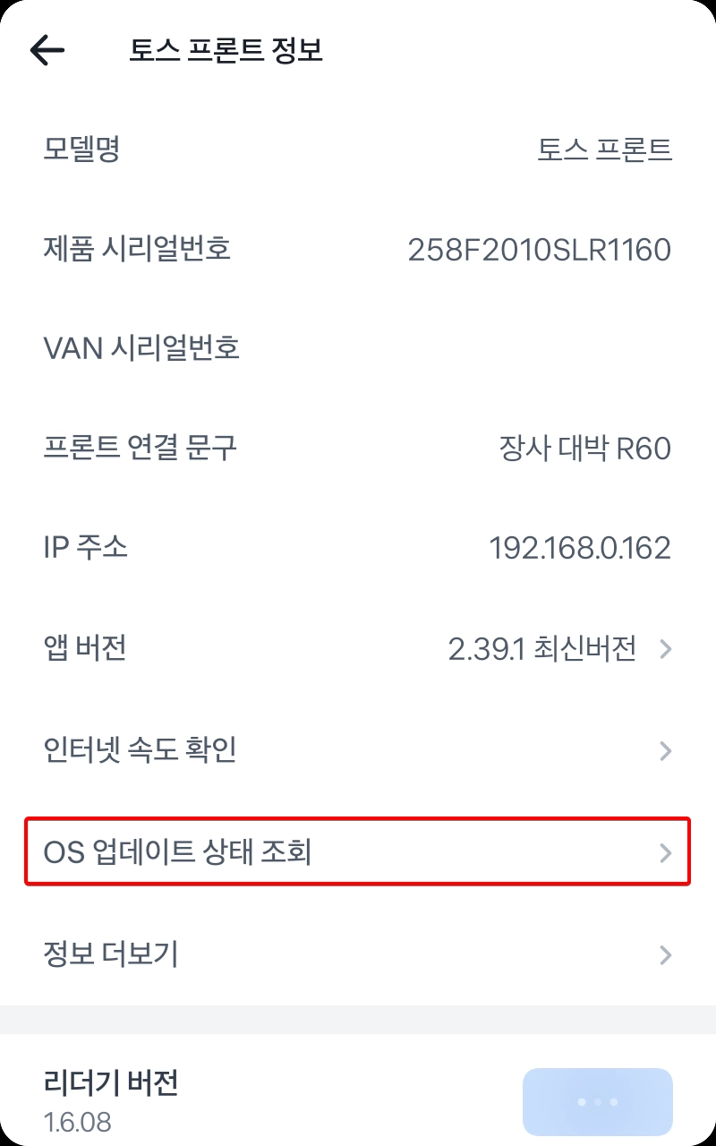 (터미널 버전확인) 우상단 설정 > 토스 터미널 정보 > OS 버전에서 확인 가능