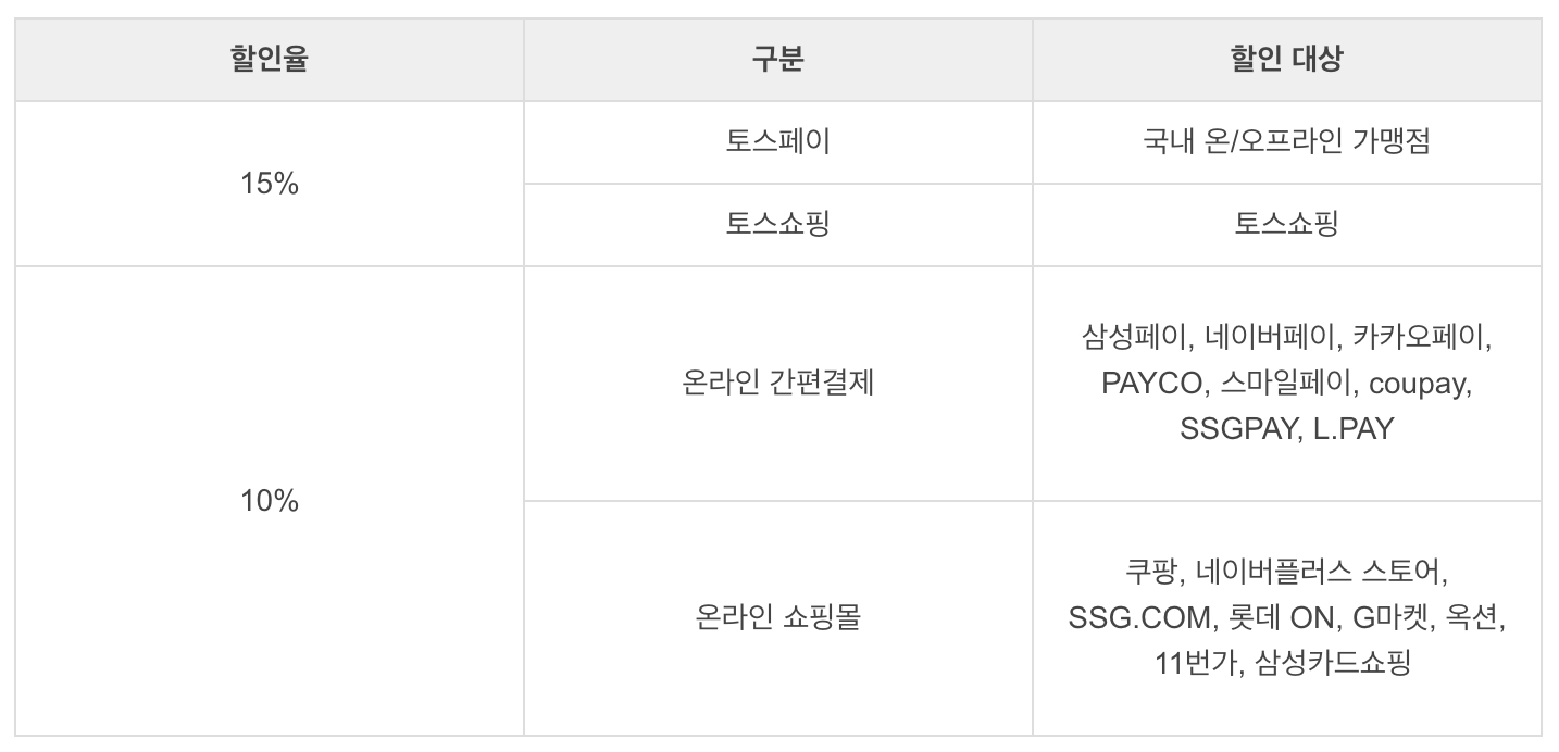 A) 토스페이/토스쇼핑 15% + 온라인 영역 10% 결제일 할인