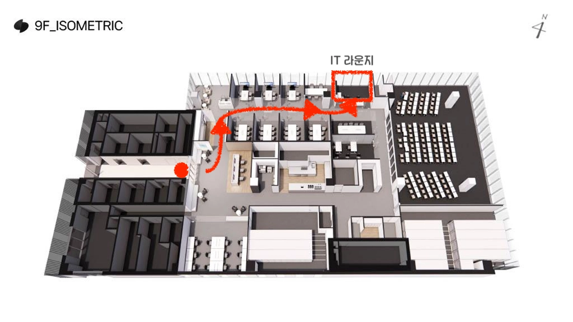 엘리베이터에서 내린 후 좌측으로 직진하면 온보딩 장소인 IT라운지에 도착 할 수 있어요!
