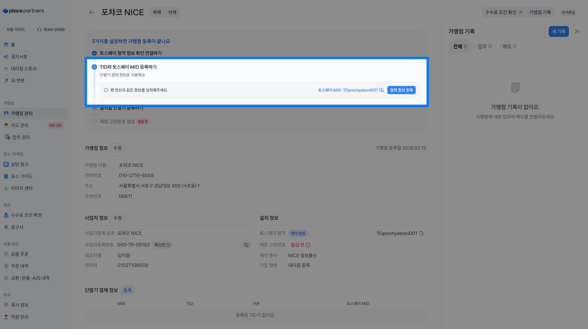 VAN 전산과 동일한 TID와 토스페이 MID를 등록해주세요.