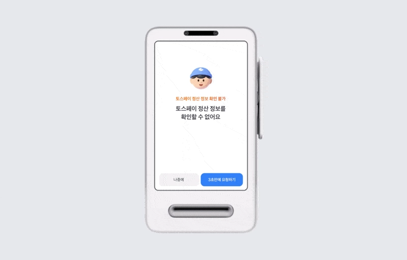 VAN 전산과 다른 토스페이 MID를 선택하면 프론트 대기 화면에 알림창이 노출돼요.