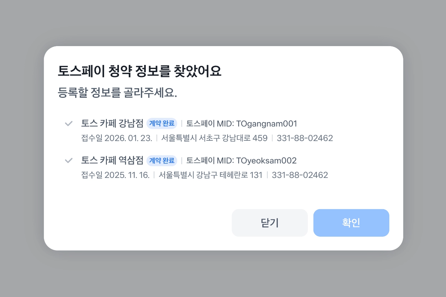 여러 개인 경우 가맹점 이름과 주소가 일치하는 정보로 연결해주세요.