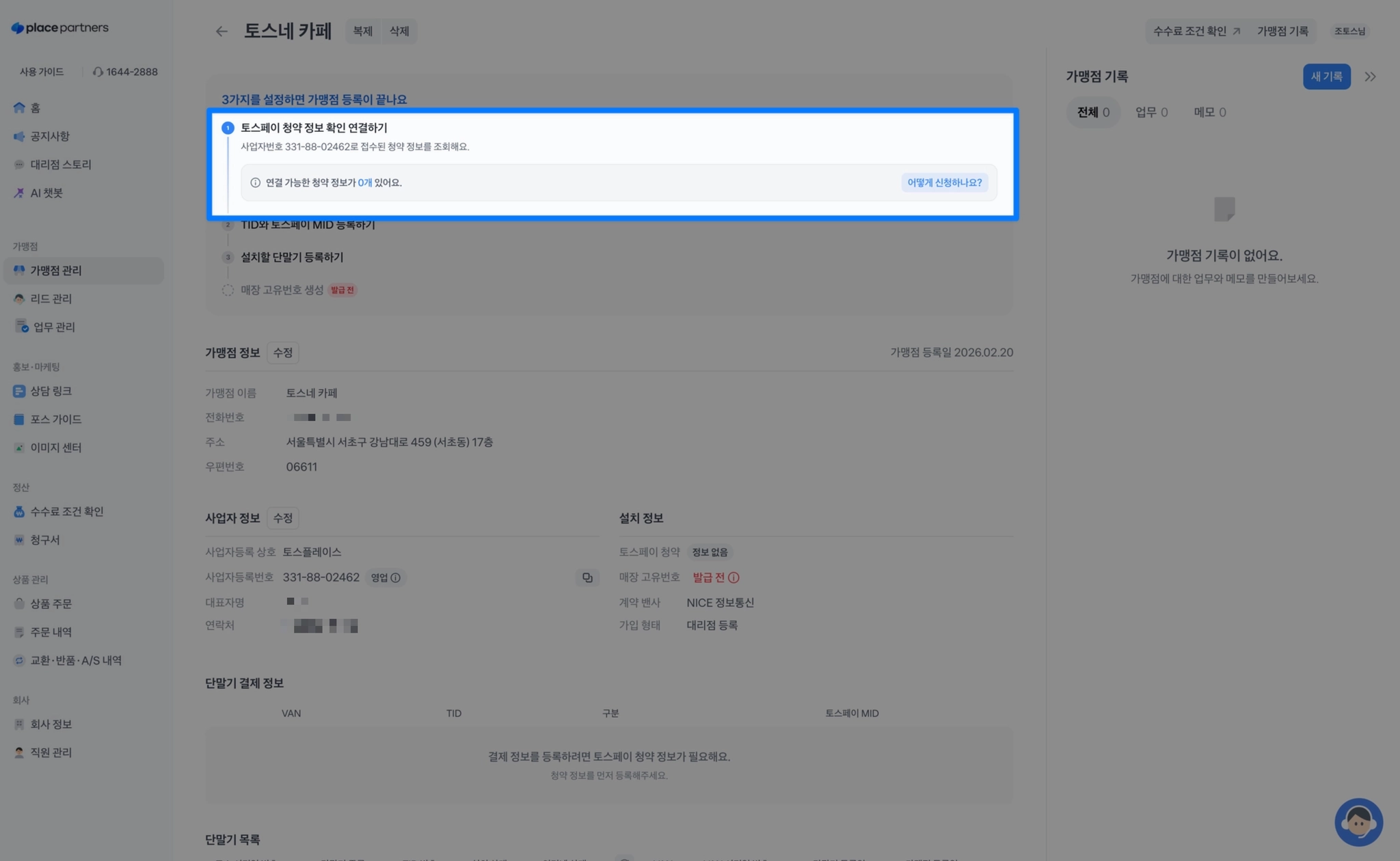 가맹점 사업자번호로 청약 정보가 없으면 신규 접수해주세요.