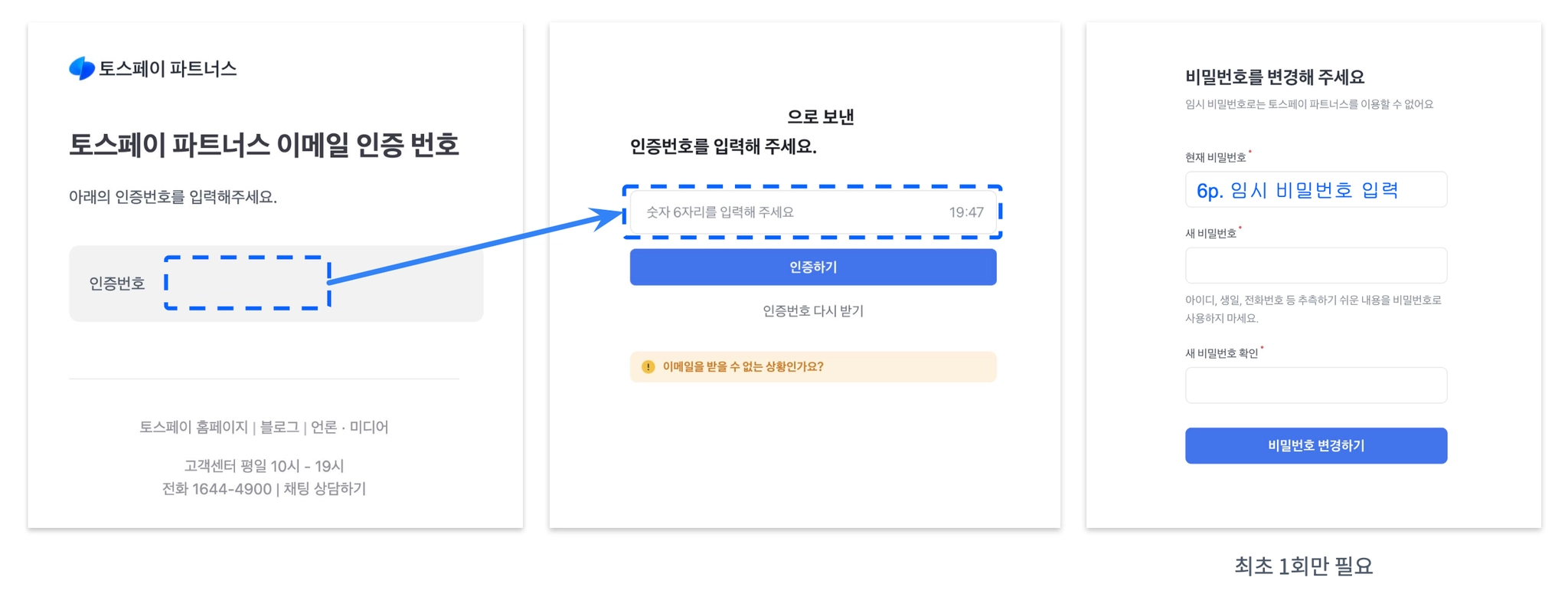 토스페이파트너스로 이동하여 발급 받으신 계정 정보로 로그인해 주세요. 보안을 위해 이메일 2차 인증을 진행해요.