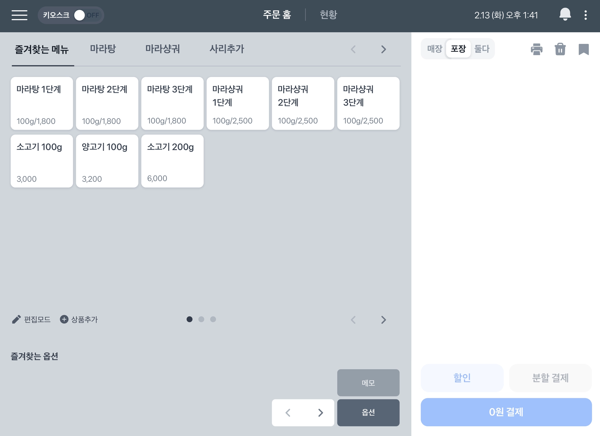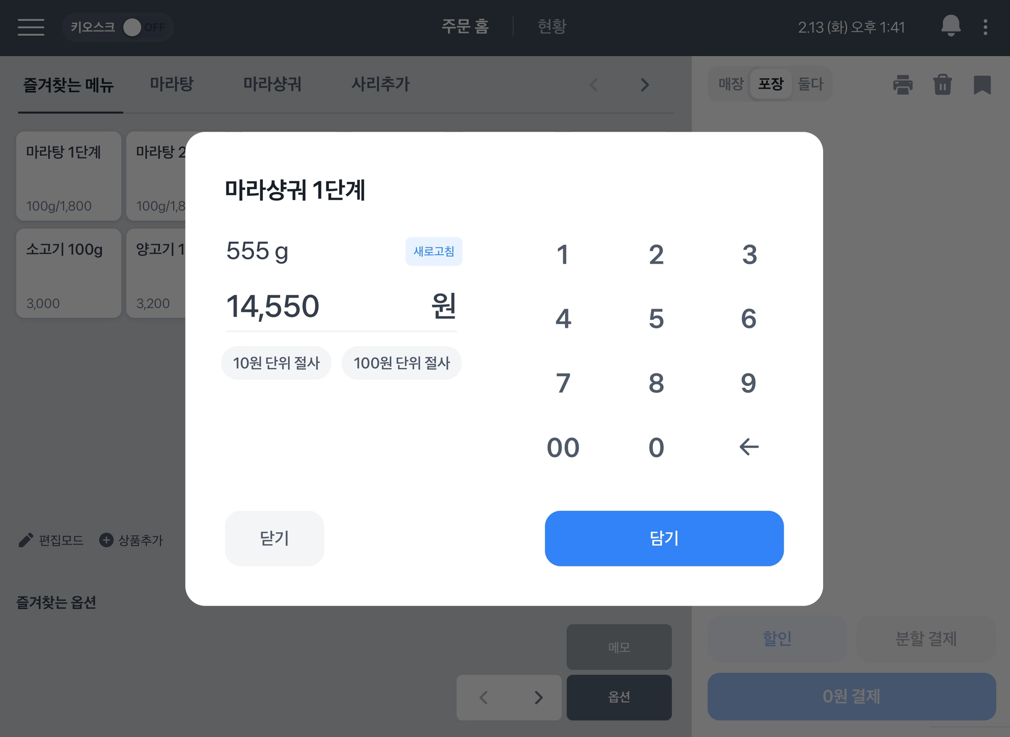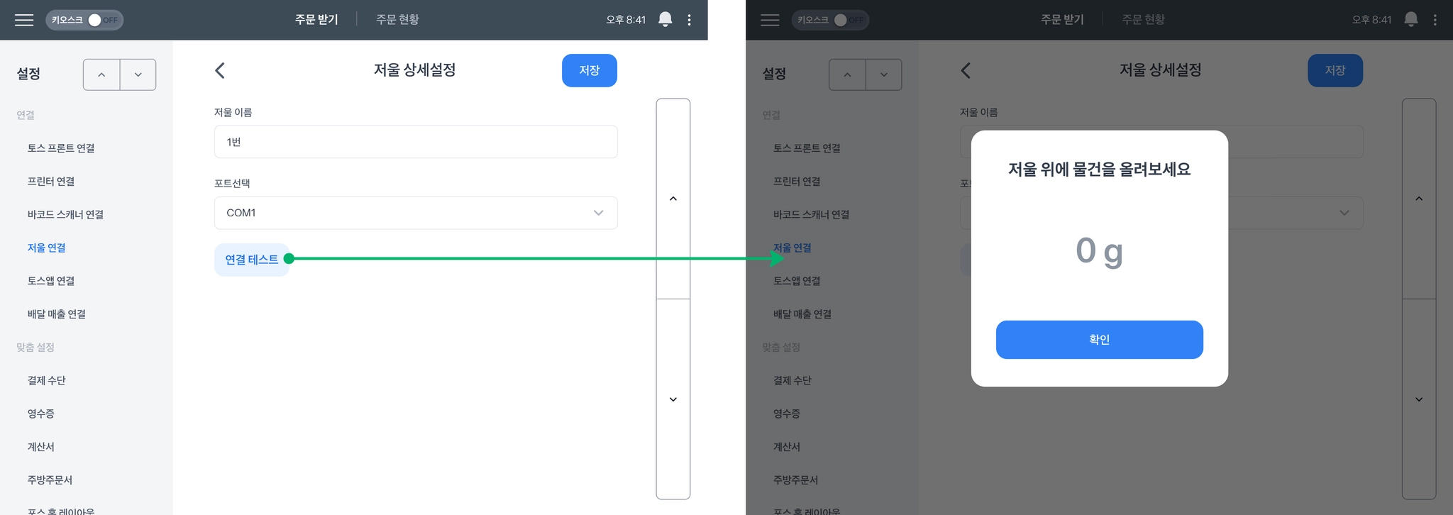 저울과 연결이 되었다면 포스 화면에 저울 무게가 떠요.