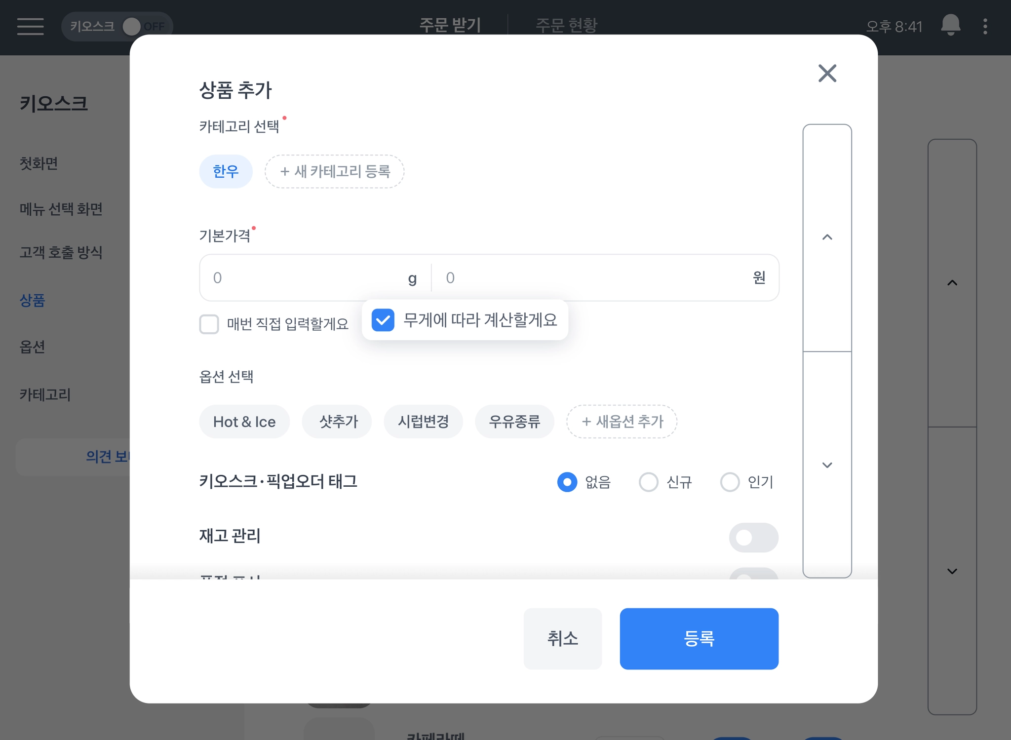 1. 포스 메뉴 [≡] > [상품 관리] > ‘무게에 따라 계산할게요’ 클릭