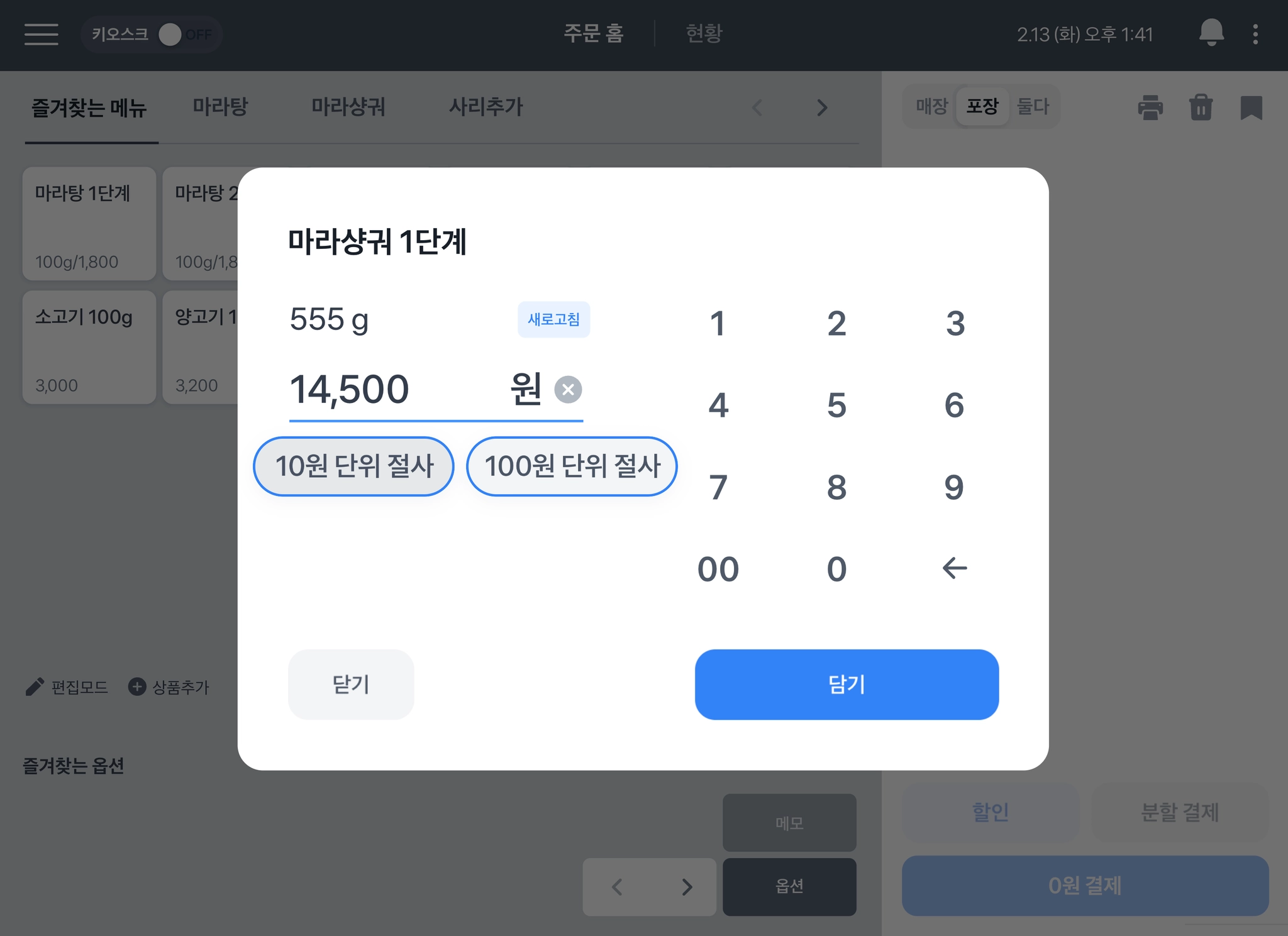 무게를 불러올 수 없을 때는 가격을 입력한 뒤 결제하면 돼요