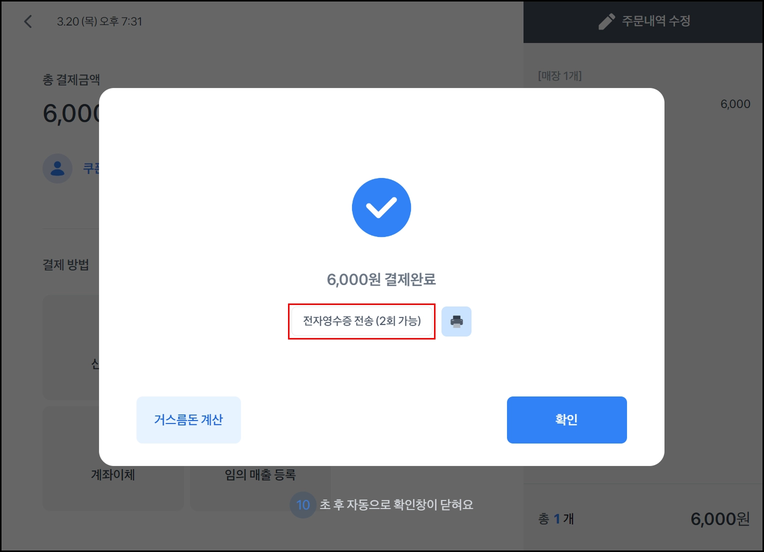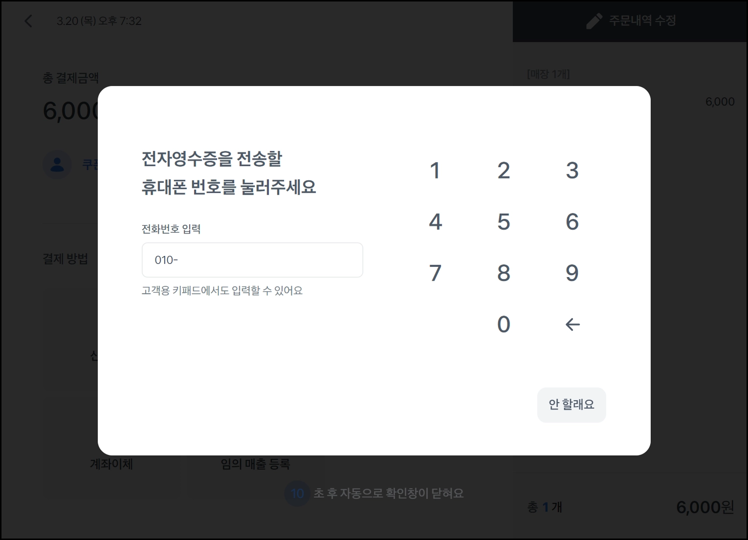 결제 완료 화면에서, 전자영수증 전송 버튼을 눌러 손님 핸드폰번호를 입력해 발송할 수 있어요.